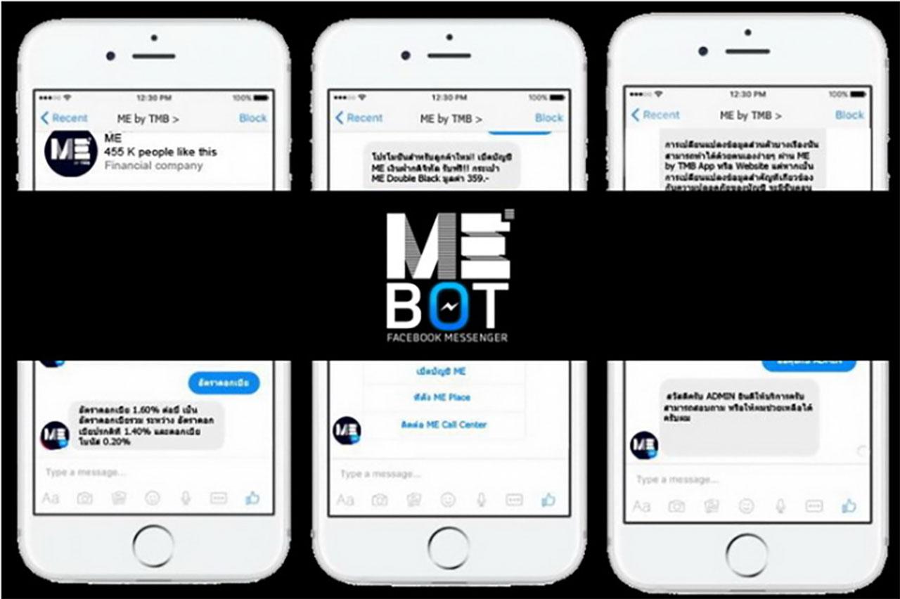 ME by TMB ดิจิทัลแบงก์กิ้ง ภายใต้คอนเซปต์ “Self-Service Banking to Get More” ให้คุณทำธุรกรรมผ่านช่องทางดิจิทัลด้วยตนเอง เพื่อผลตอบแทนที่มากกว่า เปิดตัวบริการใหม่รับปี 2560 ก้าวไปอีกขั้นในยุคดิจิทัล เพิ่มช่องทางบริการลูกค้าด้วย ME BOT ผ่านระบบ Chat Bot ในช่องทาง Facebook Messenger นับเป็นครั้งแรกของวงการธนาคารไทย ตอบโจทย์ลูกค้าไลฟ์สไตล์ดิจิทัลที่ต้องการเข้าถึงข้อมูลด้วยตนเองแบบ Real Time ตลอด 24 ชั่วโมง