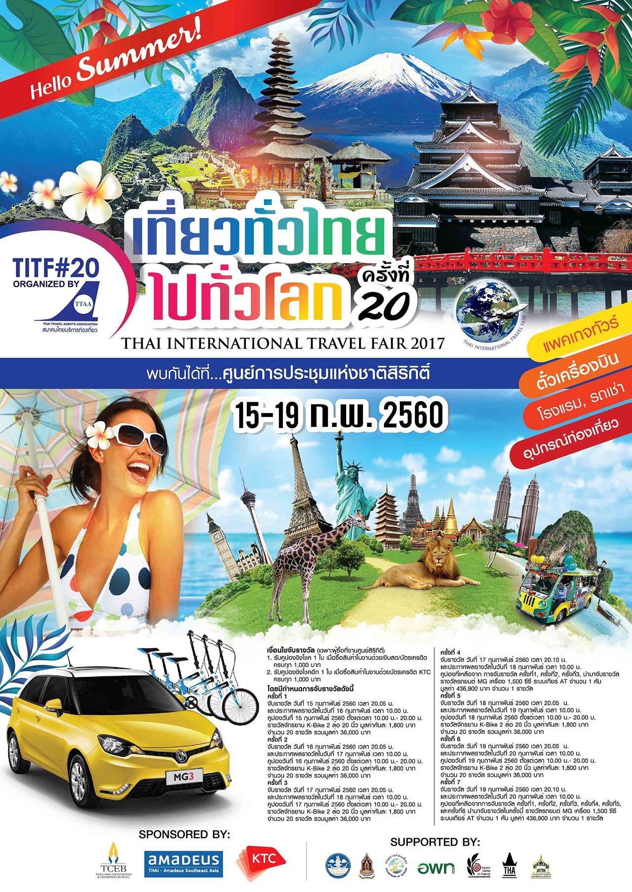 ร้อนนี้ ถ้ายังไม่มีแพลนไปไหน มา ช้อป กิน บิน เที่ยวทั่วโลกก่อนใคร ได้ในงาน เที่ยวทั่วไทย ไปทั่วโลก ครั้งที่ 20 ตั้งแต่วันที่ 15 – 19 กุมภาพันธ์ 2560 เวลา 10.00 – 21.00 น. ณ ศูนย์การประชุมแห่งชาติสิริกิติ์