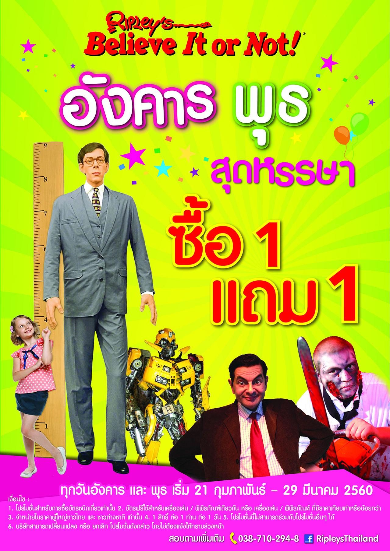 วันนี้ - 29 มี.ค. 2560 ชวนมาเล่นเครื่องเล่นราคาสุดคุ้ม กับโปรโมชั่น “อังคาร พุธ สุดหรรษา” ณ ริบลีส์ เวิลด์ พัทยา เพียงซื้อบัตรเครื่องเล่นแบบเดี่ยว ท่านจะได้รับสิทธิ์ ซื้อ 1 แถม 1 ตลอดทุกวันอังคารและวันพุธเท่านั้น แล้วมาพบกันที่ ริบลีส์ เวิลด์ พัทยา ชั้น 2 ศูนย์การค้ารอยัล การ์เด้น พลาซ่า พัทยาใต้ สามารถดูรายละเอียดและเงื่อนไขเพิ่มเติมได้ที่ http://www.ripleysthailand.com หรือโทร. 0-3871-0294