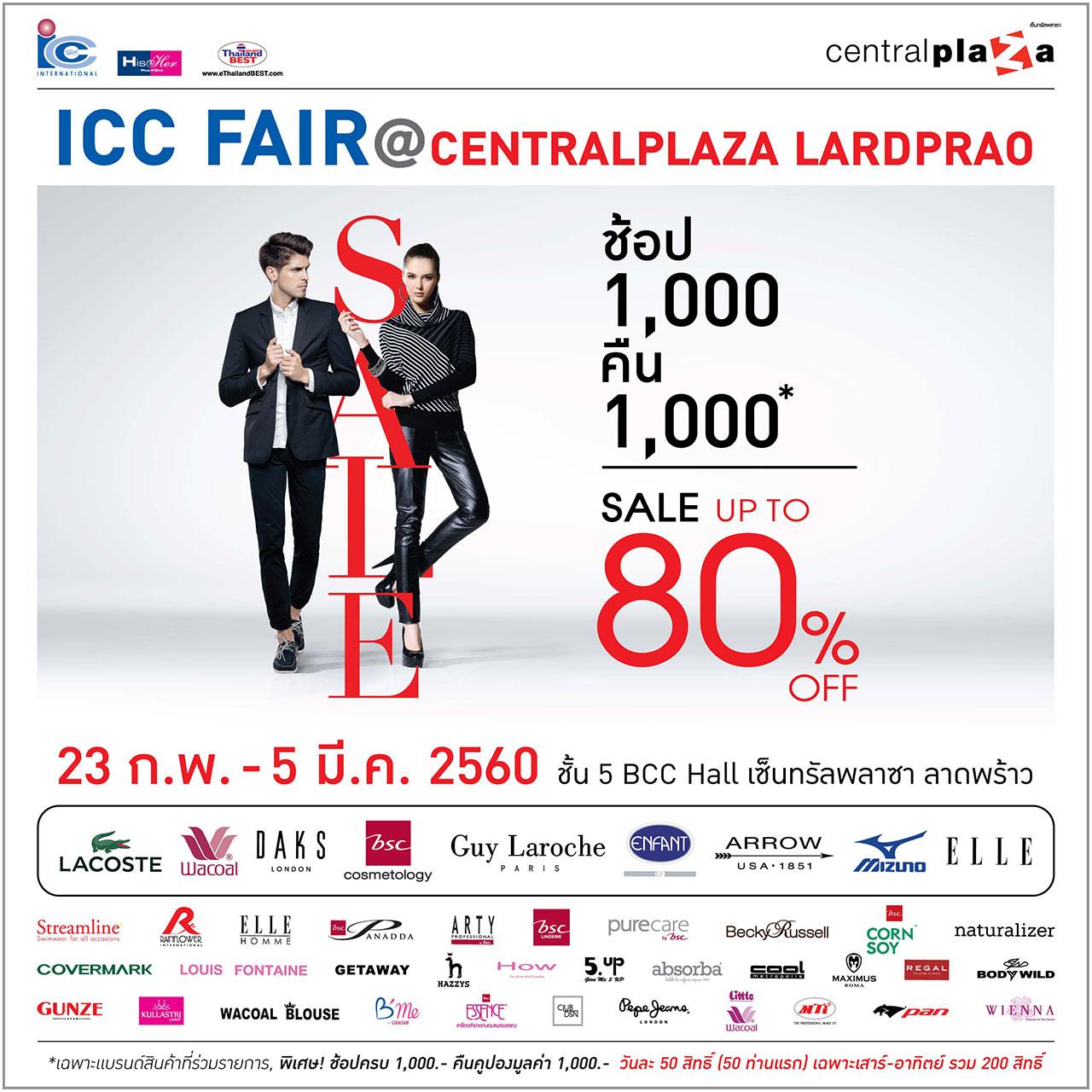 วันนี้ - 5 มีนาคม 2560 ชวนมาช็อปเสื้อผ้าแบรนด์ลดราคา ในงาน “ICC FAIR @ CENTRALPLAZA LARDPRAO” ณ ชั้น 5 BCC Hall เซ็นทรัลพลาซา ลาดพร้าว พบกับมหกรรมสินค้าราคาพิเศษ แบรนด์ชั้นนำคุณภาพที่ยกขบวนมาลดราคาสูงสุดถึง 80% เช่น Wacoal, Arrow, Lacoste, BSC, DAKS, ELLE, Guy Laroche, Mizuno, ENFANT พร้อมรับสิทธิพิเศษ! ช็อปครบ 1,000 บาท รับคืนคูปองมูลค่า 1,000 บาท รวม 200 สิทธิ์ (เฉพาะ 50 ท่านแรก วันละ 50 สิทธิ์ เฉพาะเสาร์-อาทิตย์เท่านั้น)