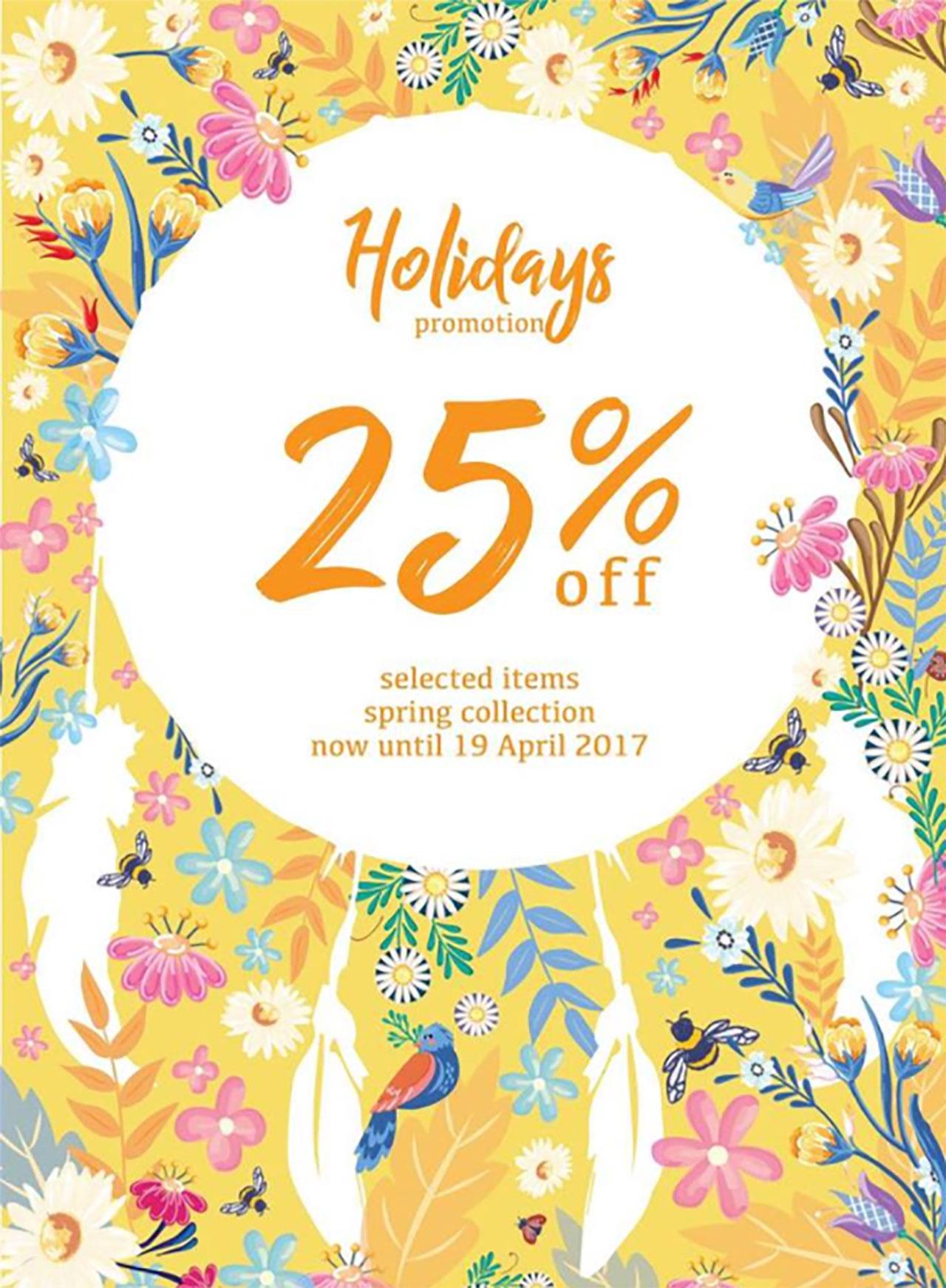 มาเอ็นจอยกับโปรโมชั่นพิเศษต้อนรับช่วงวันหยุดยาวกับ Holiday Promotion รับส่วนลด 25% สำหรับเสื้อผ้าและชุดว่ายน้ำคอลเลกชั่น Pre-Spring และ Spring 2017 ที่ร่วมรายการ ที่ร้าน Lyn Around ทุกสาขา เริ่มต้น (6 เมษายน 2560)