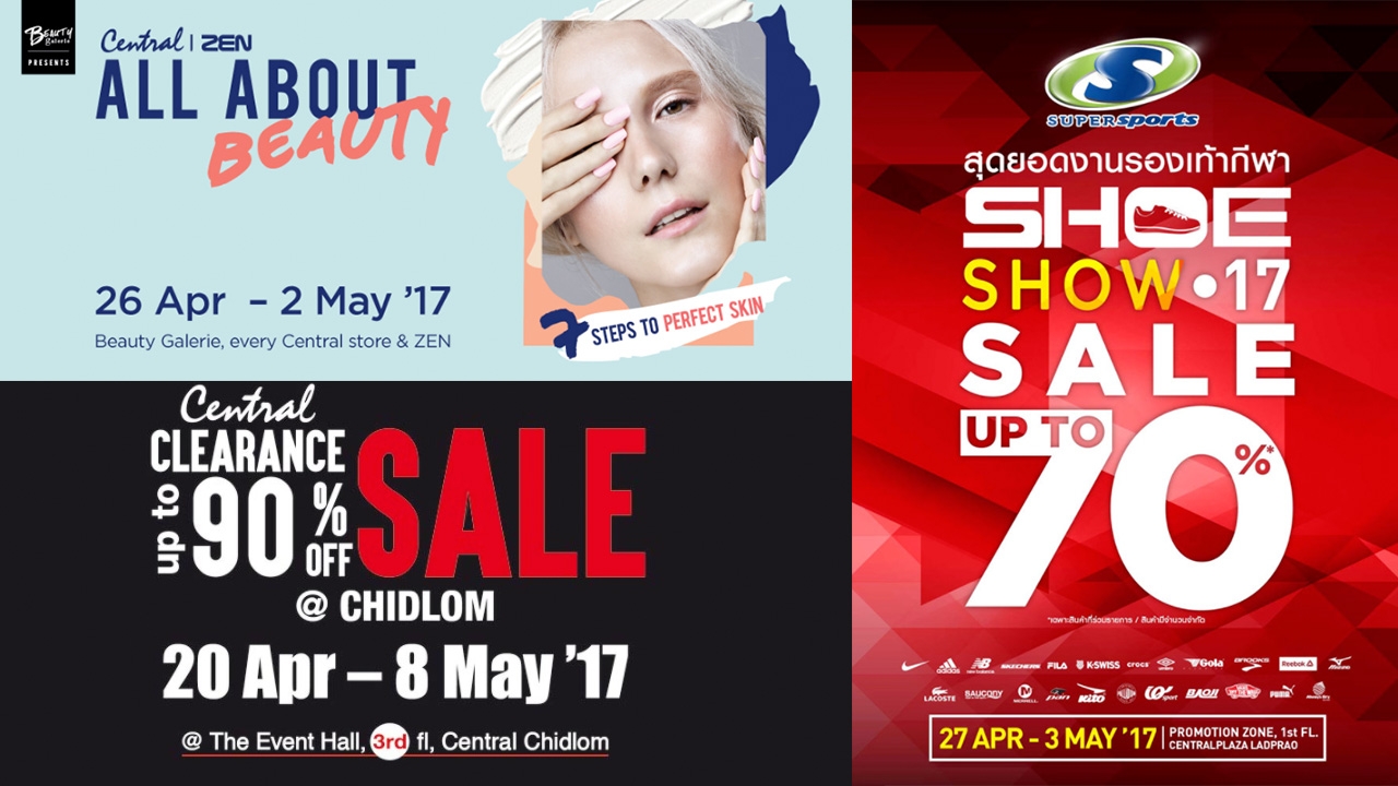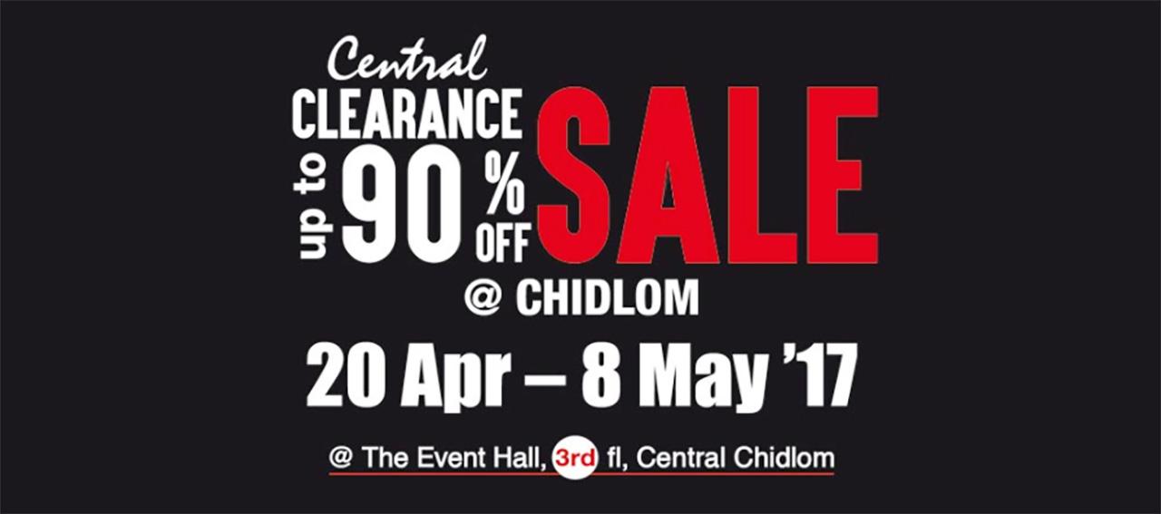 CENTRAL CLEARANCE SALE @ CHIDLOM 20 เมษายน-8 พฤษภาคม 2560 ลดล้างสต๊อกครั้งใหญ่ในรอบปี เรียกว่าไปช็อปให้จุใจ โดยทางห้างมีการเติมสินค้าใหม่ทุกวัน! แถมยังลดสูงสุด 90%ไปดูกันได้ที่ เซ็นทรัลชิดลม The Event Hall ชั้น 3