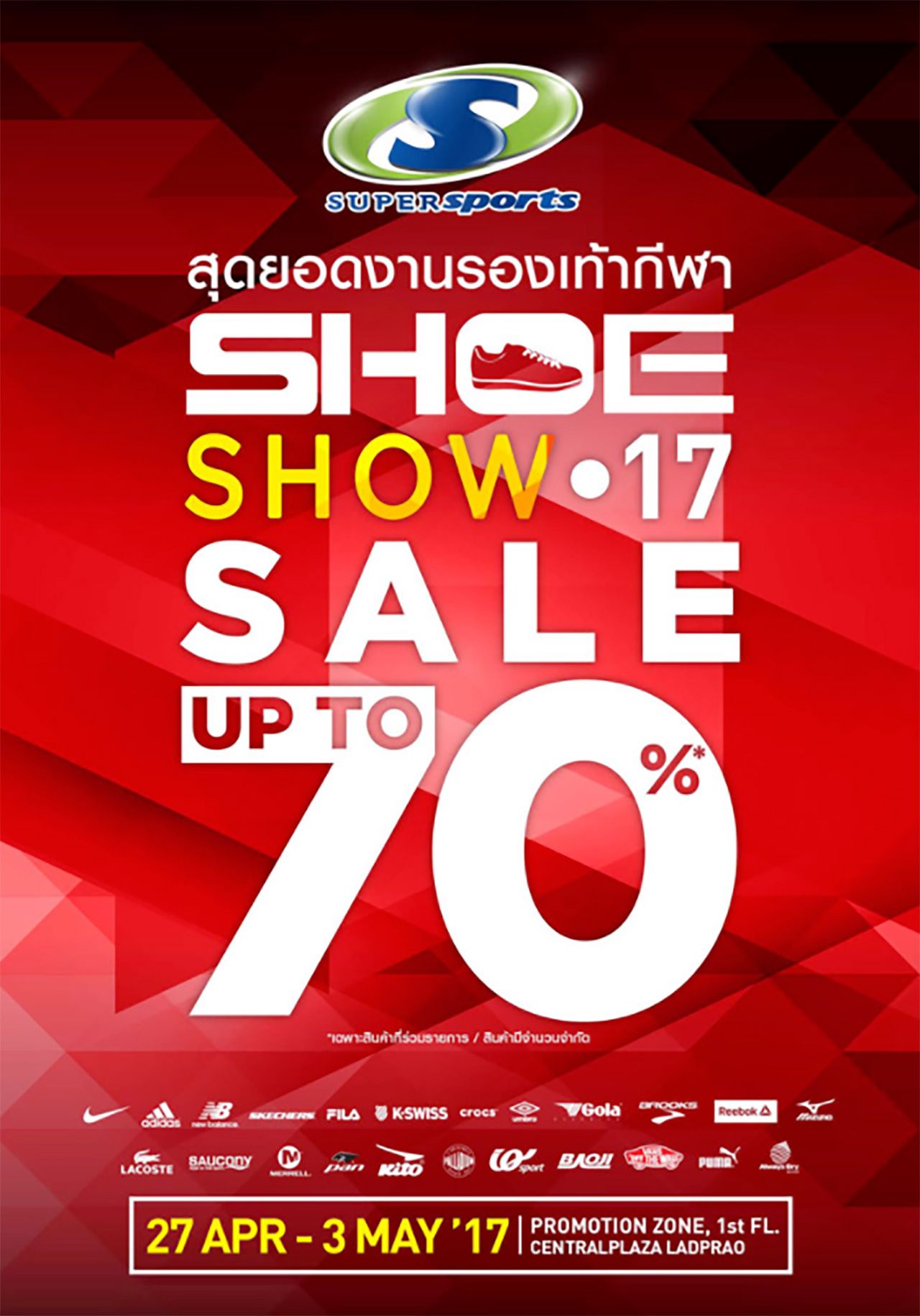ต้องเตรียมตัวให้พร้อมกันเลยทีเดียว แล้วมาช็อปให้สุด กับงาน SuperSports Shoeshow17 ลดสูงสุด 70% กับสินค้าอุปกรณ์กีฬาแบรนด์ดัง ที่ขนมาเพื่อคุณคนพิเศษ เตรียมตัวให้พร้อมแล้วมาช็อปปิ้งกัน วันที่ 27 เมษายน 2560 -3 พฤษภาคม 2560 ณ ลานโปรโมชั่น เซ็นทรัลลาดพร้าว เหล่าสาวกไม่ควรพลาดนะจ๊ะ..