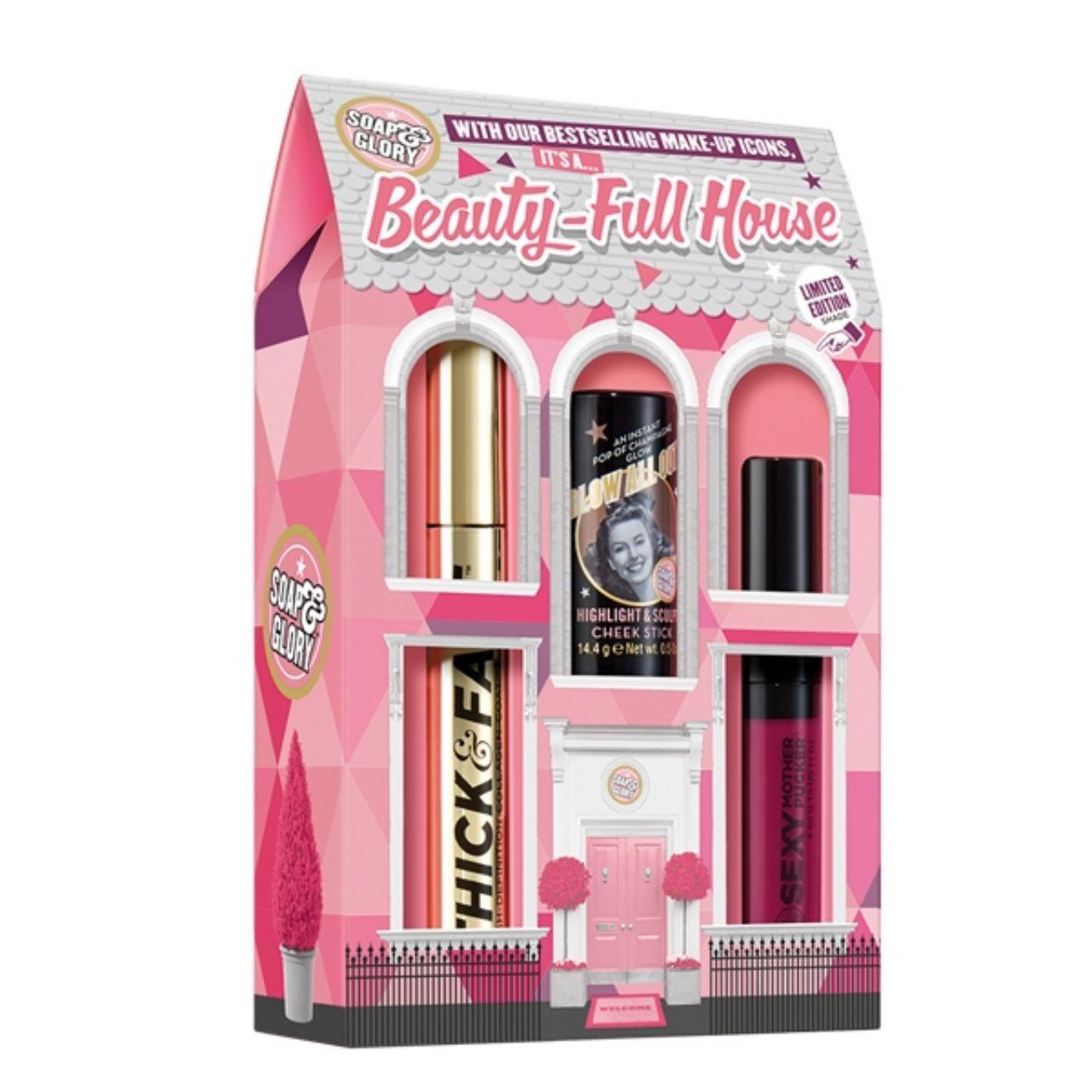 โซพ แอนด์ กลอรี่ บิวตี้ ฟูล เฮ้าส์ ลิมิเต็ดอิดิชั่น ถูกดีไซน์ออกมาให้น่ารัก ไม่ทำให้สาวๆ ผิดหวัง หน้าเป๊ะในเซตเดียว ประกอบด้วย Soap & Glory Thick and Fast Mascara 10ml Soap & Glory Glow All Out Highlight and Sculpt Cheek Stick 14.4g Soap & Glory Sexy Mother Pucker Lip Gloss 4ml ขนาดไซส์มินิ พกพาสะดวก กับสีที่ไม่เคยมีมาก่อน