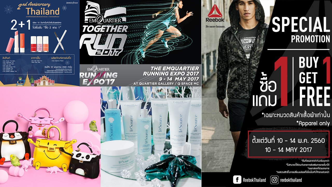 ดิเอ็มควอเทียร์ ยังได้จัด “THE EMQUARTIER RUNNING EXPO 2017” ระหว่างวันที่ 9 – 14 พฤษภาคม 2560 บริเวณ Quartier Gallery และ Q Space MC ชั้น M โดยแผนก Sports Mall ร่วมกับแบรนด์กีฬาชั้นนำ ขนทัพสินค้ากีฬาวิ่งลดราคาครั้งยิ่งใหญ่แห่งปี สูงสุด 60% อาทิ NIKE, ASIC, ADIDAS, UNDER AMOUR, PUMA, REEBOK ฯลฯ ตั้งแต่วันที่ 1 พฤษภาคม – 31 ธันวาคม 2560 (หรือครบสิทธิ์ก่อน) สอบถามรายละเอียดเพิ่มเติม ณ จุดแคชเชียร์ แผนก Sports Mall