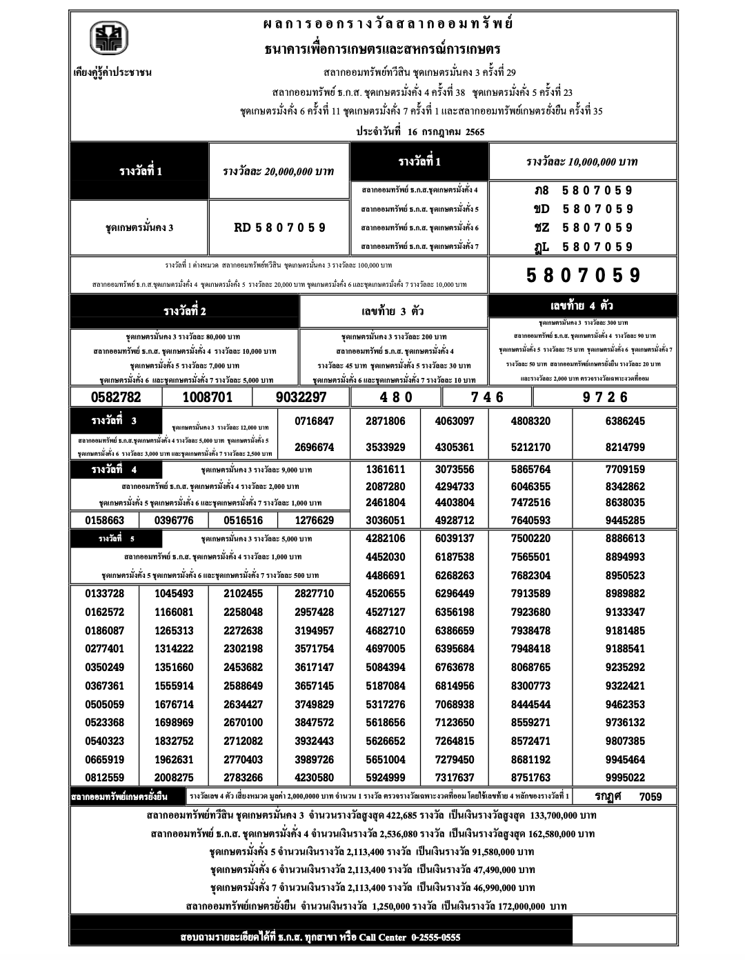 ผลสลาก ธ.ก.ส. งวดวันที่ 16 กรกฎาคม 2565