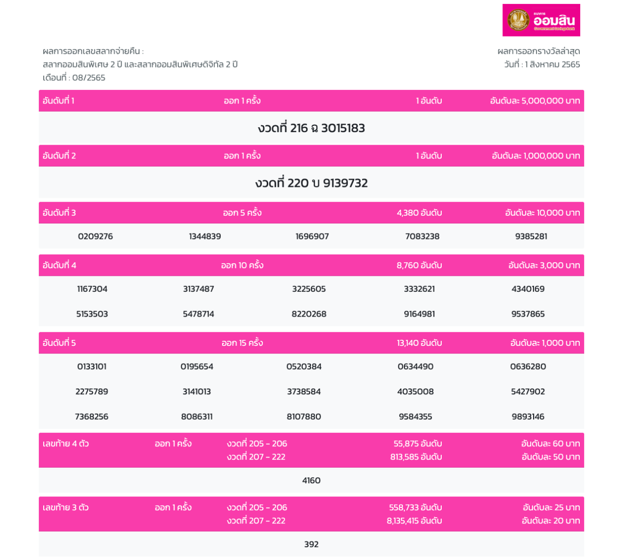 ผลสลากออมสิน "พิเศษ 2 ปี" และ "พิเศษดิจิทัล 2 ปี" งวดวันที่ 1 สิงหาคม 2565