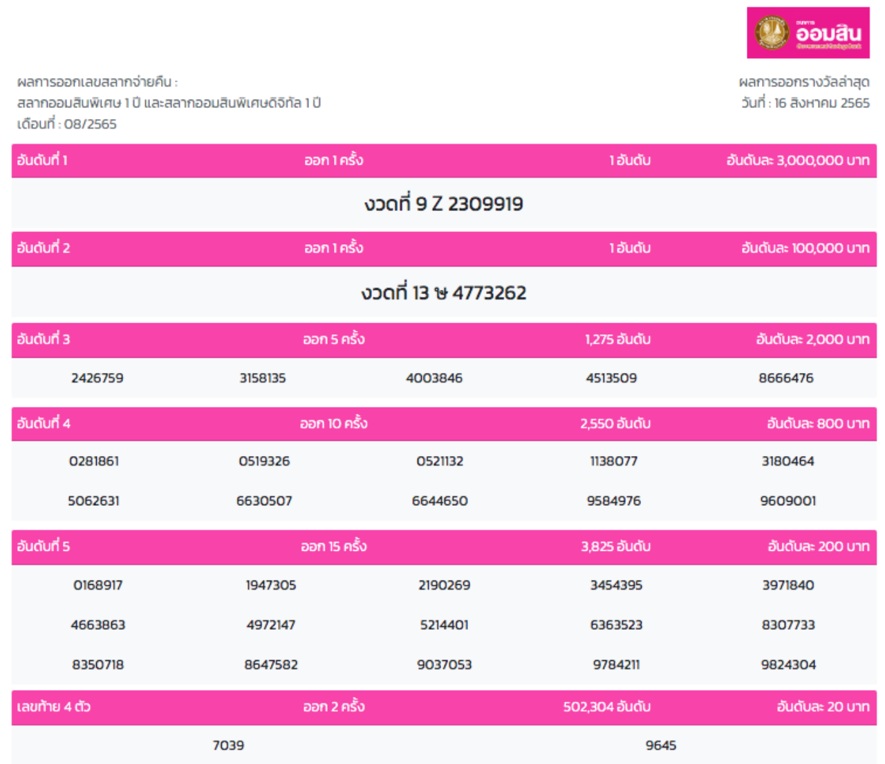ผลสลากออมสิน "พิเศษ 1 ปี" งวดวันที่ 16 สิงหาคม 2565