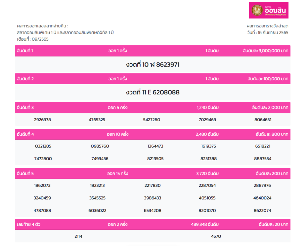 ผลสลากออมสิน "พิเศษ 1 ปี" งวดวันที่ 16 กันยายน 2565