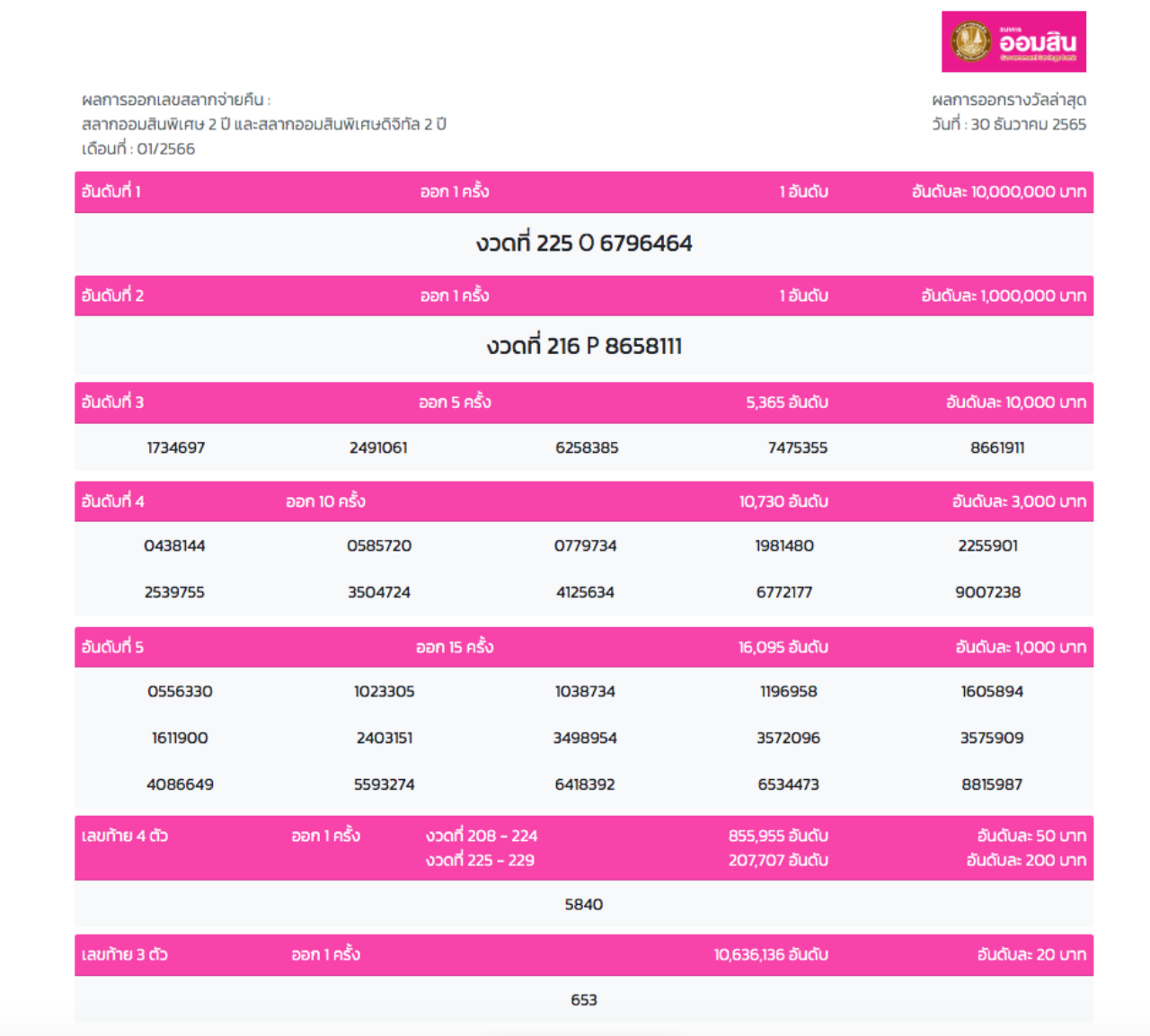 ผลสลากออมสิน "พิเศษ 2 ปี" และ "พิเศษดิจิทัล 2 ปี" งวดวันที่ 30 ธันวาคม 2565