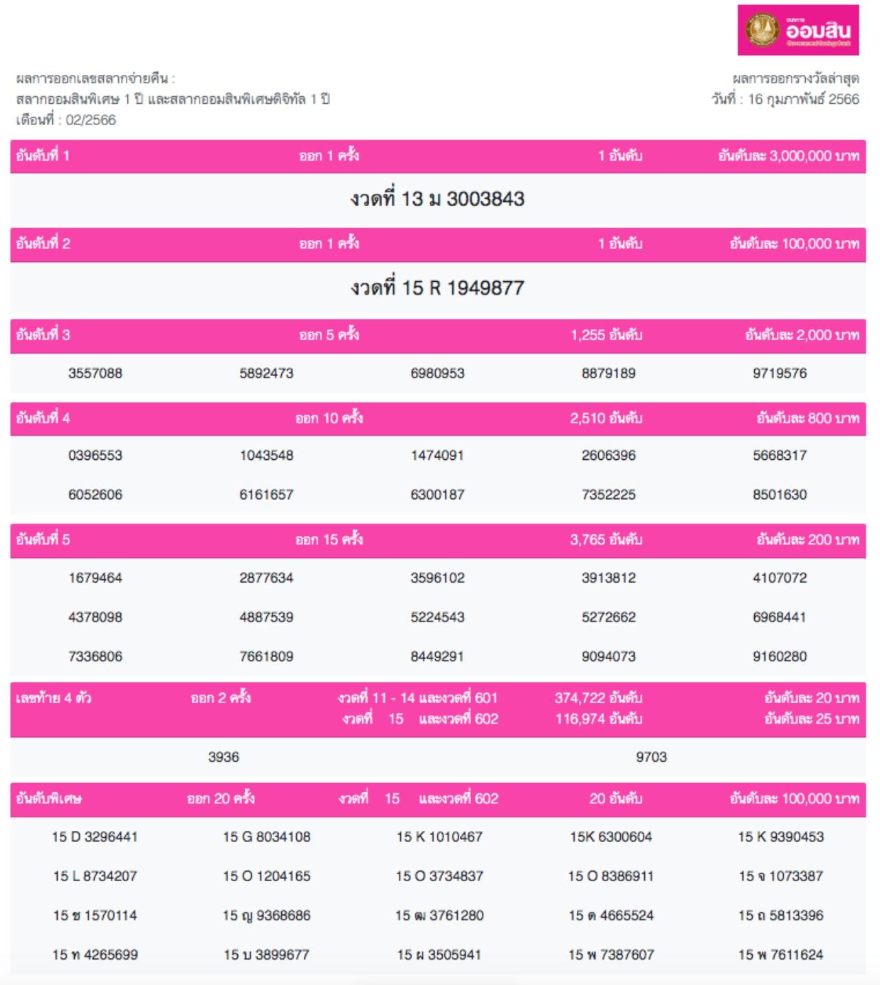 ผลสลากออมสิน "พิเศษ 1 ปี" งวดวันที่ 16 กุมภาพันธ์ 2566