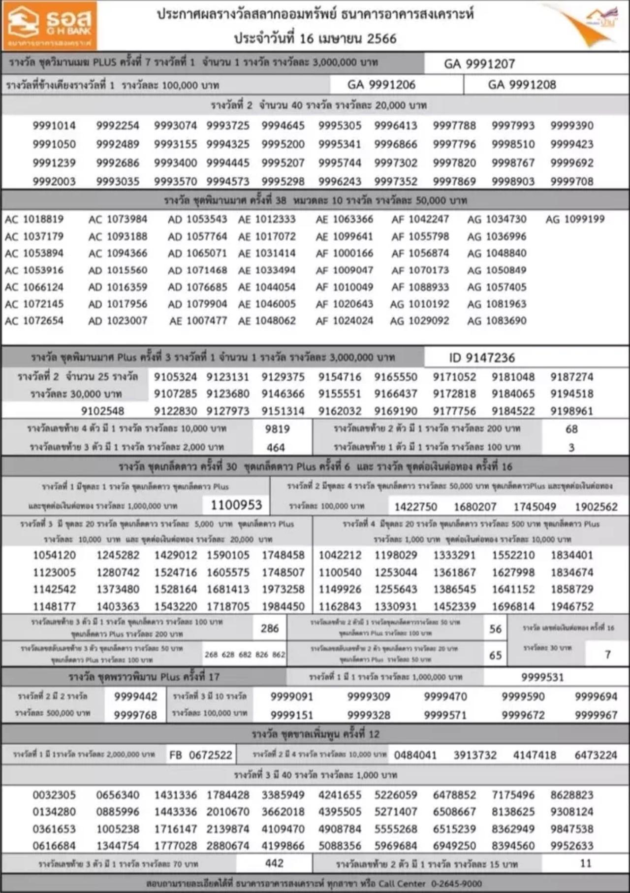 ผลสลากออมทรัพย์ ธอส. งวดวันที่ 16 เมษายน 2566