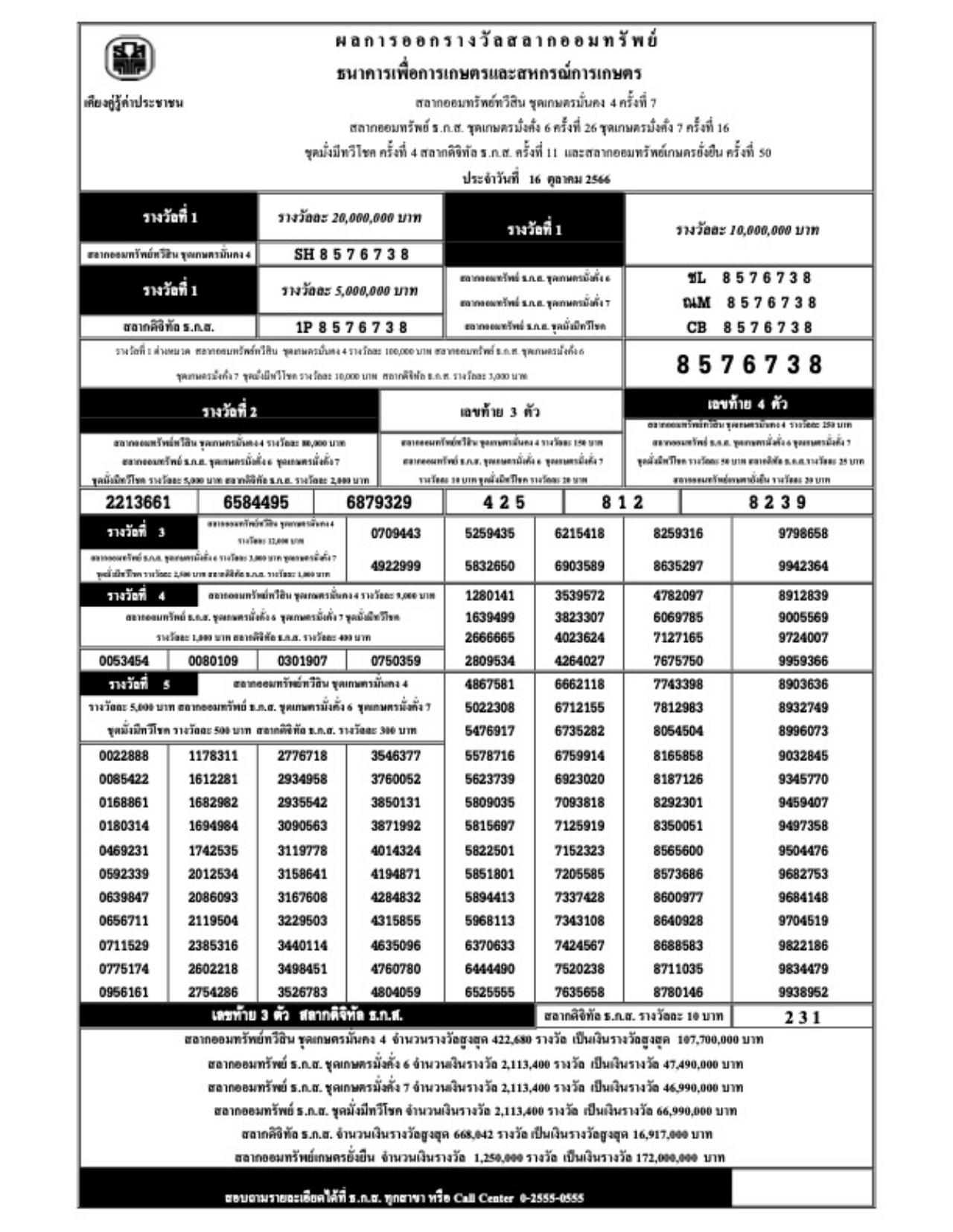 ผลสลาก ธ.ก.ส. งวดวันที่ 16 ตุลาคม 2566