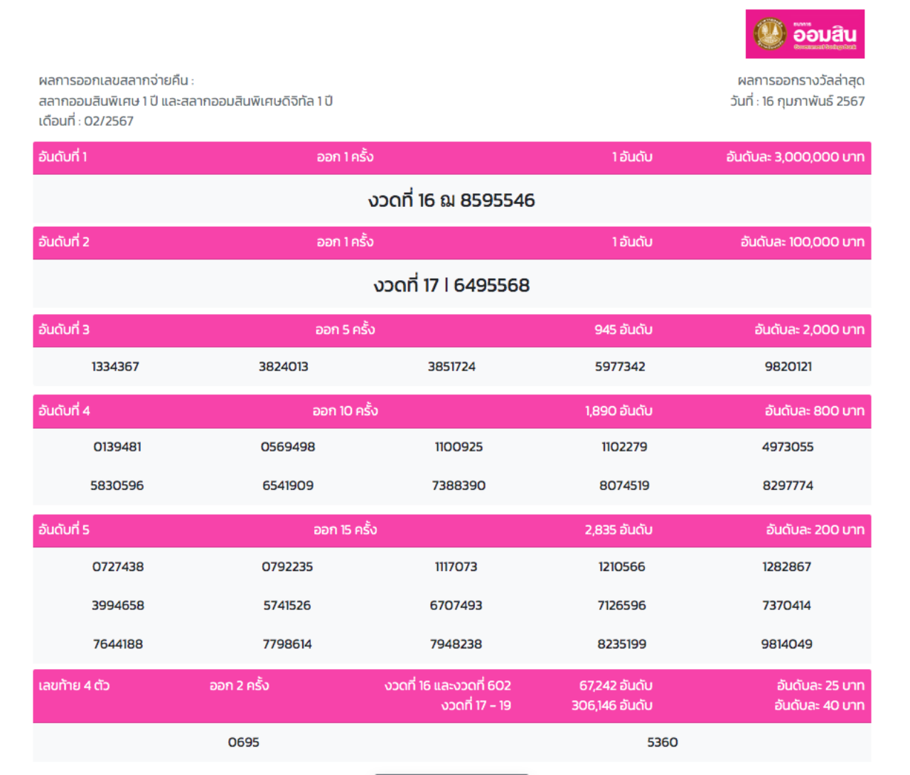 ผลสลากออมสิน "พิเศษ 1 ปี" งวดวันที่ 16 กุมภาพันธ์ 2567