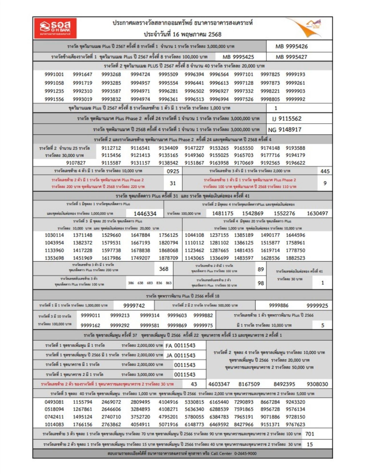 ผลสลากออมทรัพย์ ธอส. งวดวันที่ 16 พฤษภาคม 2568