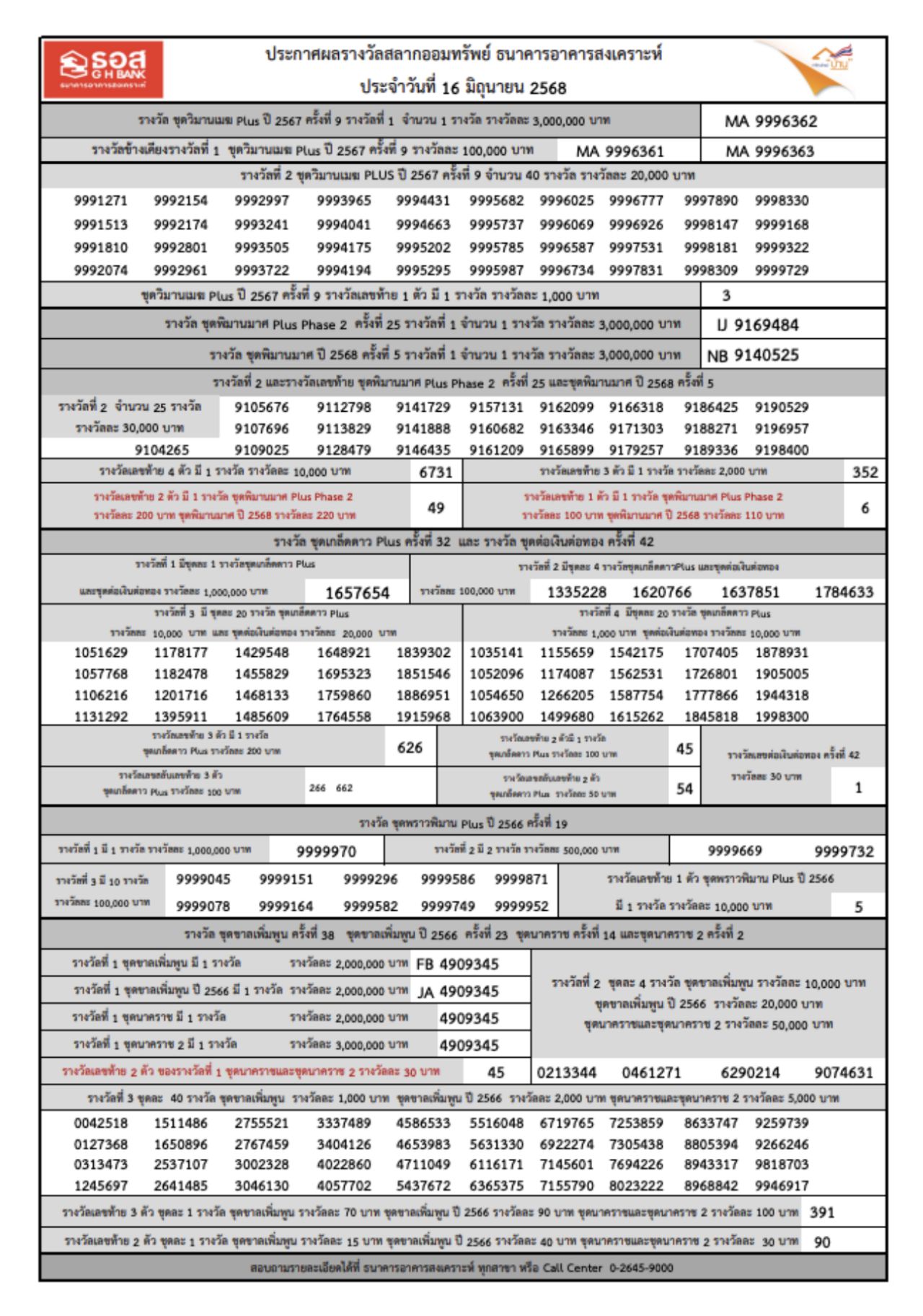 ตรวจสลาก ธอส. 16/6/68 ประกาศผลสลากออมทรัพย์ ธนาคารอาคารสงเคราะห์ ชุดวิมานเมฆ Plus ปี 2567, ชุดพิมานมาศ Plus, ชุดพิมานมาศ Plus Phase 2, ชุดพิมานมาศ ปี 2568, ชุดเกล็ดดาว Plus, ชุดพราวพิมาน Plus ปี 2566, ชุดขาลเพิ่มพูน, ชุดขาลเพิ่มพูน ปี 2566 และ ชุดนาคราช งวดประจำวันที่ 16 มิถุนายน 2568