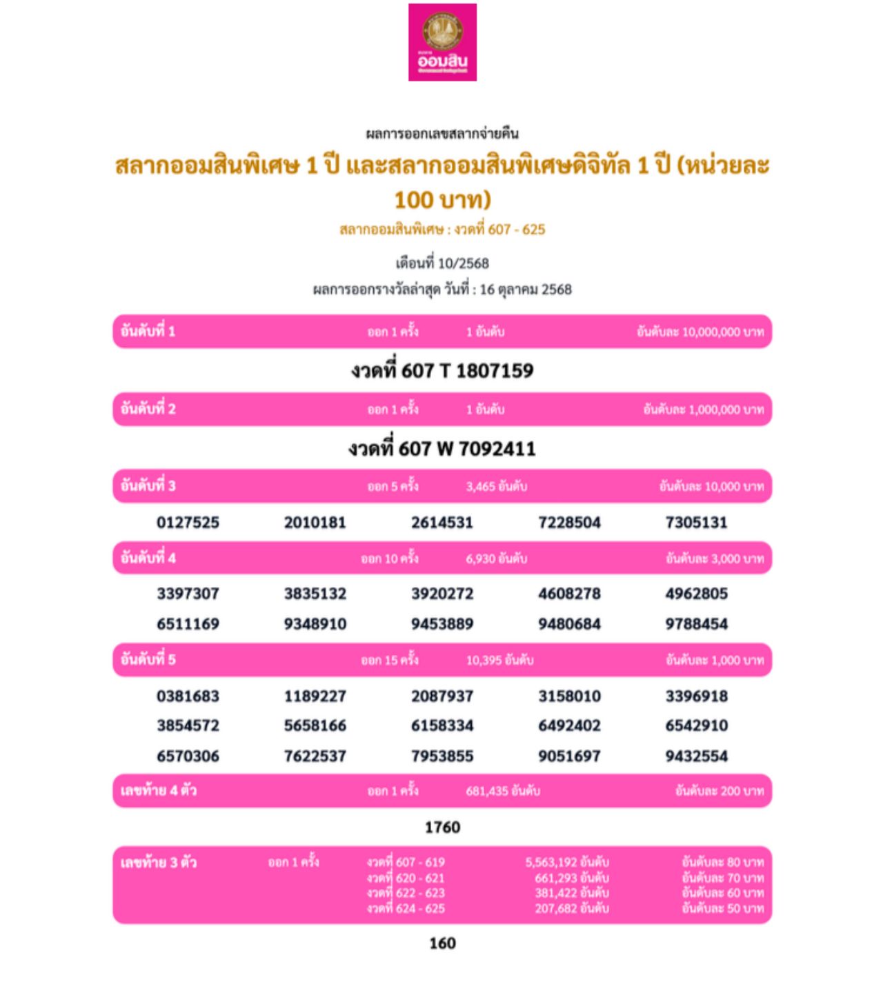 ผลสลากออมสิน "พิเศษ 1 ปี" งวดวันที่ 16 ตุลาคม 2568