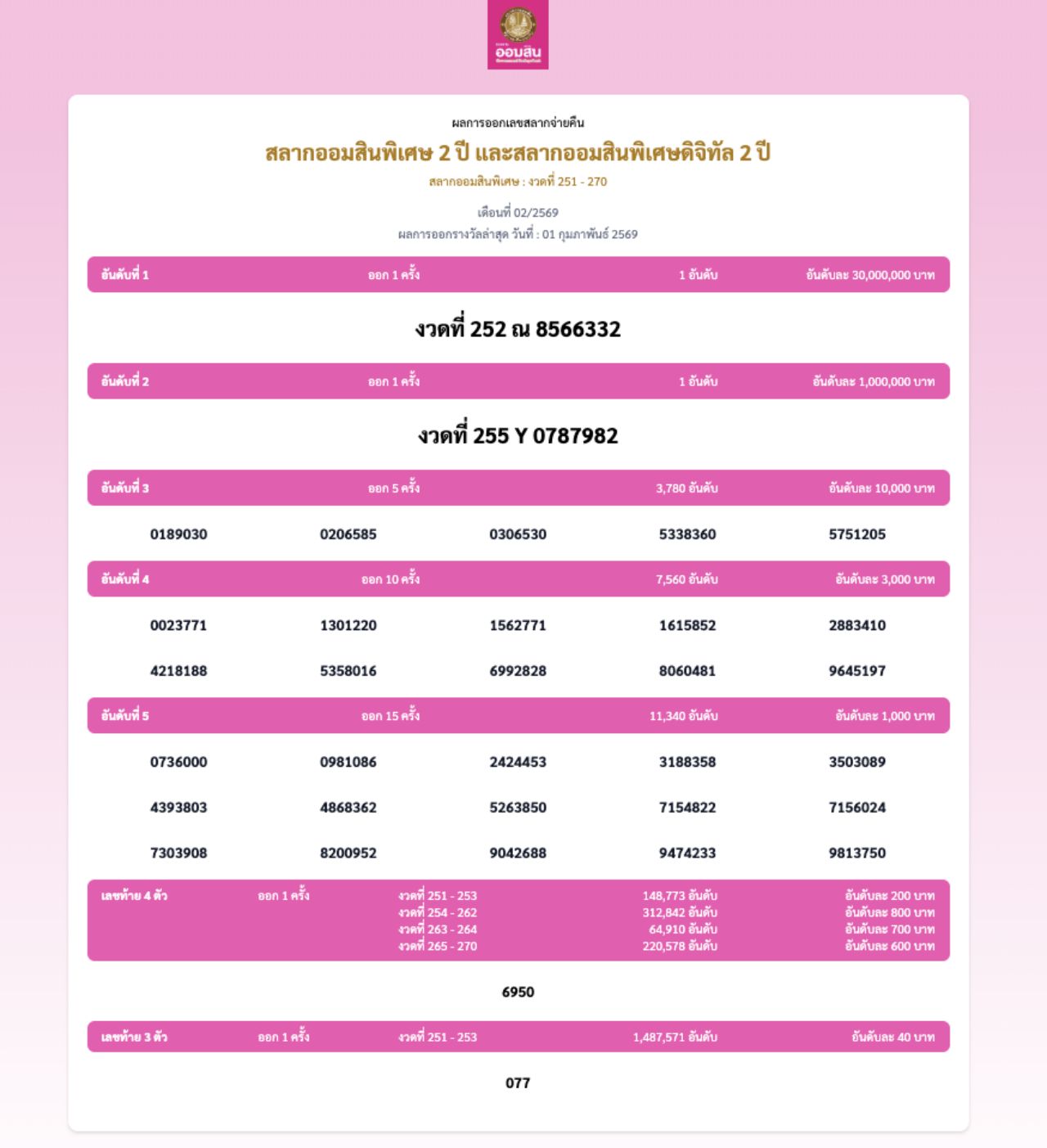 ตรวจสลากออมสิน 1/2/69 ประกาศผลสลากออมสินพิเศษ 2 ปี และสลากออมสินพิเศษดิจิทัล 2 ปี งวดล่าสุด ประจำวันที่ 1 ก.พ. 2569