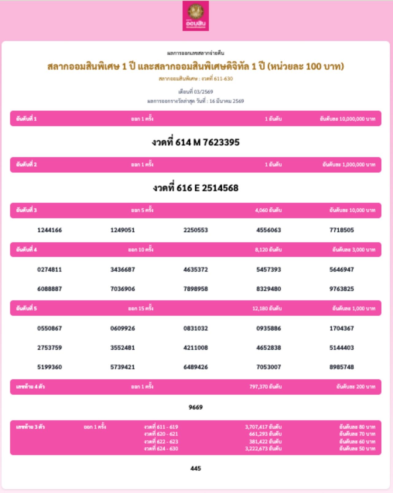 ผลสลากออมสิน "พิเศษ 1 ปี" งวดวันที่ 16 มีนาคม 2569