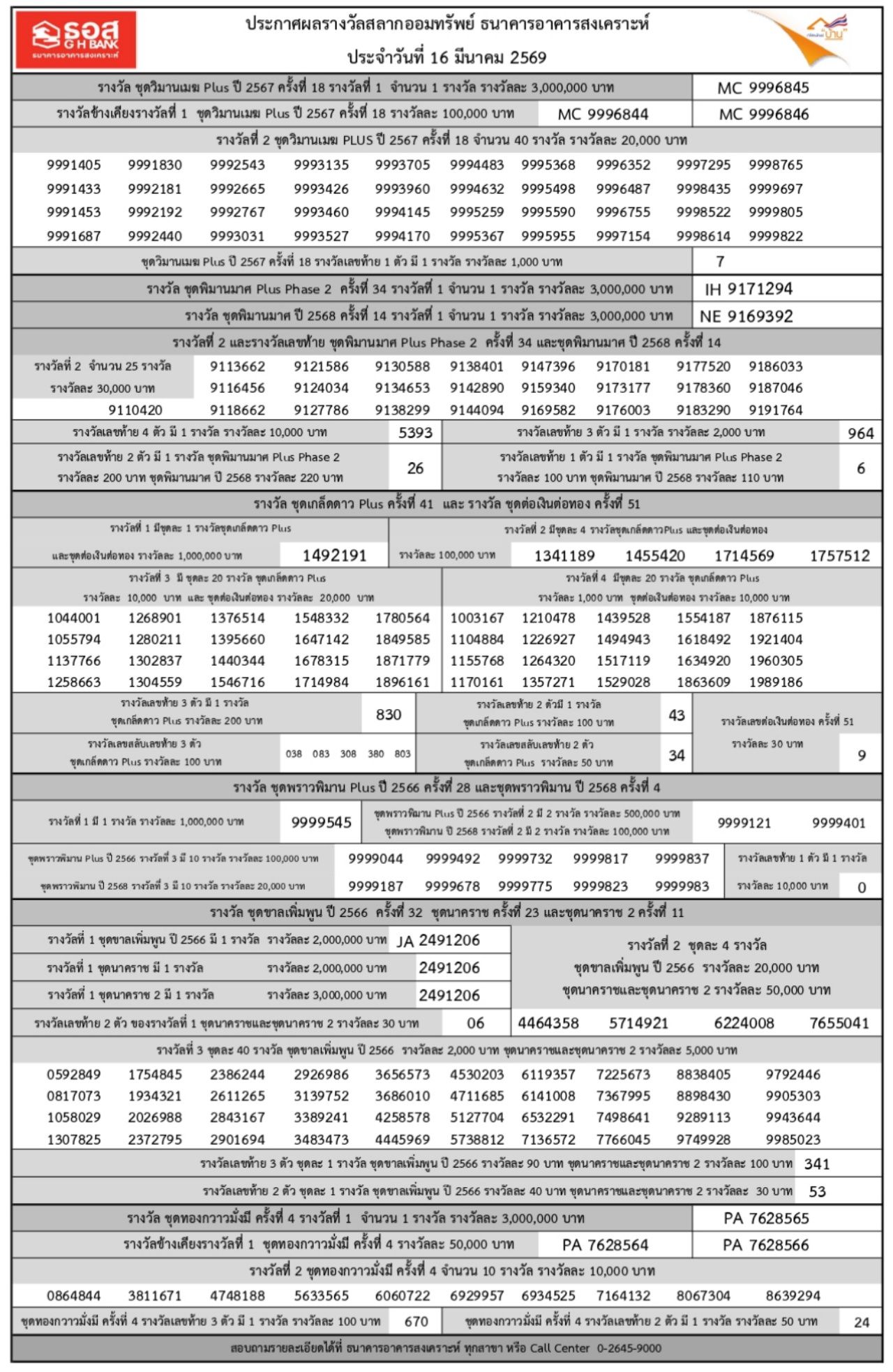ผลสลากออมทรัพย์ ธอส. งวดวันที่ 16 มีนาคม 2569