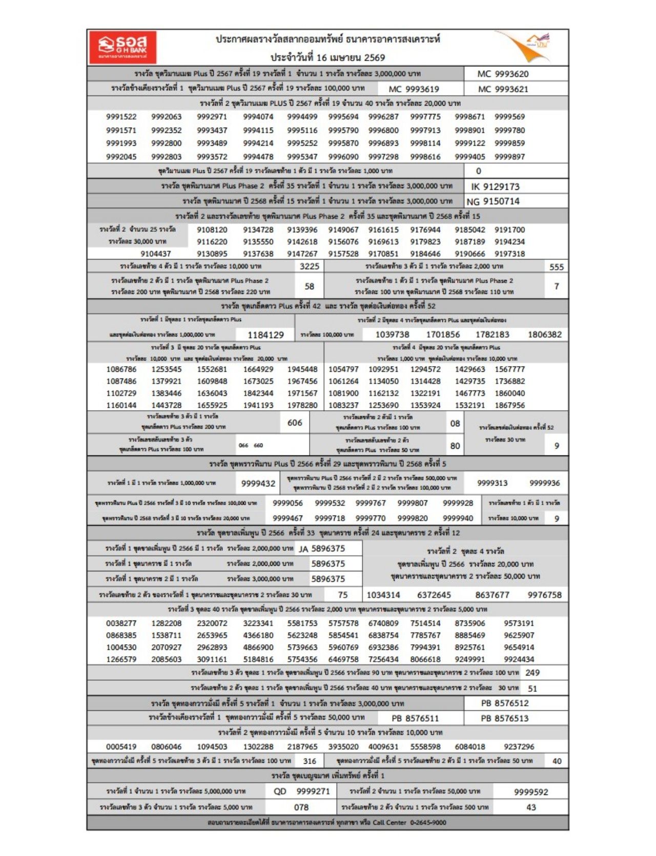 ตรวจสลาก ธอส. 16/4/69 ประกาศผลสลากออมทรัพย์ ธนาคารอาคารสงเคราะห์ งวดประจำวันที่ 16 เมษายน 2569