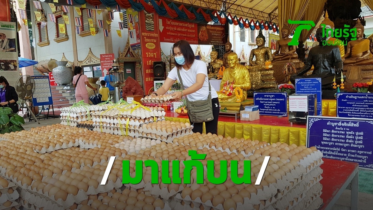 วันที่ 5 เม.ย. 2564 ผู้สื่อข่าวรายงานว่า ที่วัดสว่างอารมณ์ แคแถว ต.ขุนแก้ว อ.นครชัยศรี จ.นครปฐม น.ส.ชลรดา เขาลาด อายุ 26 ปี อาชีพแม่บ้าน นำไข่ไก่สด 5,000 ฟอง มาแก้บน พระเงิน พระทอง และองค์ท้าวเทพมหาพรหม 4 หน้า 8 กร องค์ใหญ่สูง 5 เมตร ที่ให้โชคลาภถูกลอตเตอรี่รางวัลที่ 4 และที่ 5 อย่างละ 1 ใบ ได้เงินร่วม 60,000 บาท เพื่อนำไปใช้จ่ายในช่วงโควิด-19 เพราะโรงงานที่ทำอยู่ปิด