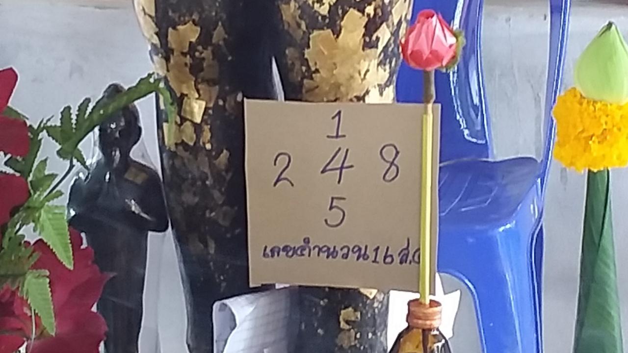 ทั้งนี้ นักเสี่ยงโชคได้ส่องไปที่บริเวณขาไอ้ไข่ จะเห็นตัวเลขคำนวณ โดยมีคนที่เคยมาแล้วสังเกตเห็นจะโชคดีทุกครั้ง แต่ต้องจับคู่สลับกัน ซึ่งงวดนี้มีเลข 1, 8, 5, 2, 4 สำหรับขันน้ำมนต์นั้นส่วนใหญ่เห็นเลข 025, 18, 81 สุดแท้โชคชะตาของใครของมัน.