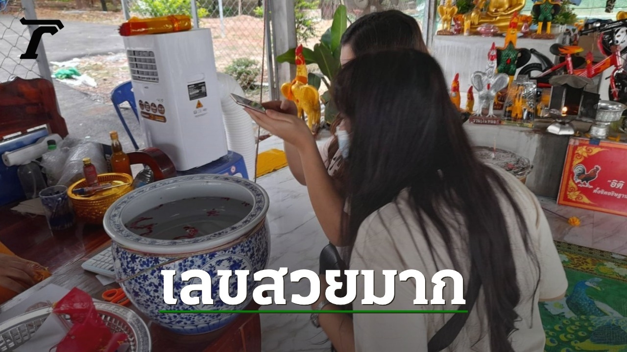 ทั้งนี้ ก็ไม่พลาดส่องไปที่เลขหางประทัด ซึ่งมีเลข 467 และ 05 ก่อนกลับสองสาวได้ไปส่องที่ขันน้ำมนต์ ตามสายตาสาวบอกว่าเห็นน้ำตาเทียนเป็นเลข 4, 6, 5, 8 บางคนยังมองเห็นเป็น 846 ตามสายตาของสองสาวที่เพิ่งเดินทางมาขอโชคกับไอ้ไข่ครั้งแรก.