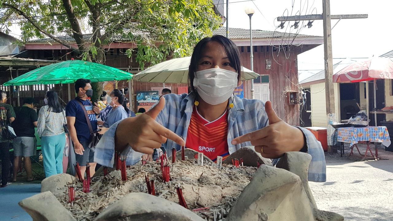 หลังเสร็จสิ้นพิธีแล้ว ผู้คนที่มาร่วมพิธีต่างเข้าแถวเพื่อไปกราบไหว้ขอพร บางรายก็มีการถวายธนบัตรฉบับละ 20 บาท เหน็บไว้ที่มือและวางที่หน้าตัก ตนเองเลยนึกขึ้นได้ว่าอยากแลกธนบัตรเพื่อเก็บเป็นเงินขวัญถุง และนำเลขธนบัตรไปเสี่ยงโชค จึงหยิบธนบัตรฉบับละ 20 บาท ออกมาจากกระเป๋า 2 ใบ แล้วเข้าแถวโดยนำพวงมาลัยติดมือไปคล้องด้วย พอถึงคิวขอพร ก็นำพวงมาลัยคล้องที่มือท้าวเทพพนาสูร แล้วอธิษฐานขอโชคขอลาภจากท่าน ก่อนที่จะนำธนบัตรแลกกับท่าวเทพพนาสูร 1 ใบ ได้เลขลงท้าย เลข 494