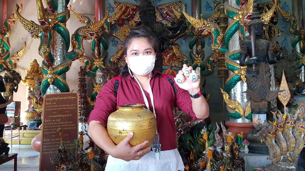 สำหรับวันนี้ ได้เขย่าเซียมซี ตั้งใจให้หล่นไม้เดียวคือเลข 27 และล้วงไข่ในไหทองคำขอโชคใหญ่ ก่อนล้วงไข่ได้ยกไหขึ้นเหนือศีรษะตั้งใจอธิษฐาน หากลูกถูกรางวัลดังเลข 3 ตัวที่หยิบมา จะกลับมาทำบุญ จากนั้นได้ล้วงขึ้นมา 3 ลูก เป็นหมายเลข 0, 8, 5 ก่อนที่จะเดินไปหาซื้อลอตเตอรี่ตามแผงในวัดลุ้นโชคต่อไป.
