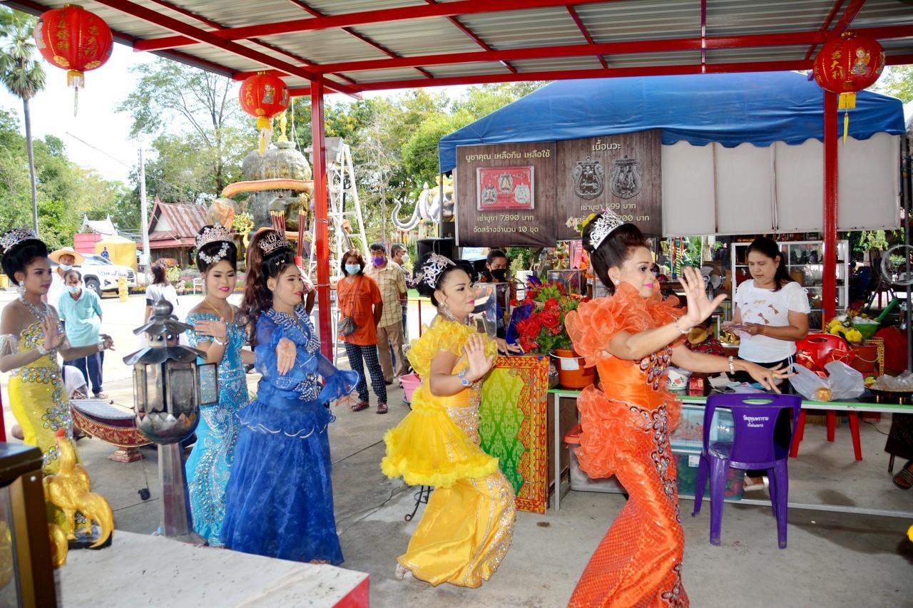 โดยจ้างนางรำ มารำถวาย พร้อมนำหัวหมู 9 หัว ประทัด 20,000 นัด มาจุดแก้บน โดยนางรำ ได้รำถวายที่หน้าหลวงพ่อสำเร็จทันใจก้าวหน้า จากนั้นได้ไปรำวงรอบพ่อขุนช้างมหาเศรษฐีและศาลพ่อแก่ รวม 9 รอบ อย่างสนุกสนาน
