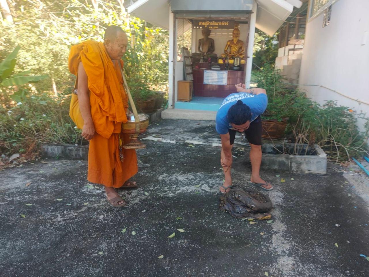 งูเหลือมยาว 4 เมตร บาดเจ็บ ตาบอด กะโหลกแตก เลื้อยมาขดหน้าศาลหลวงปู่ชีวกฯ ในวัด เชื่อเป็นงูเจ้าที่มาให้หมอชีวกฯ รักษา เซียนหวยไม่พลาดแห่ดูตีเป็น "เลขเด็ด"