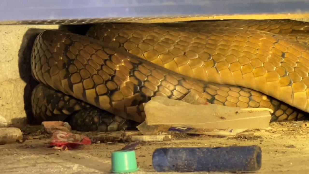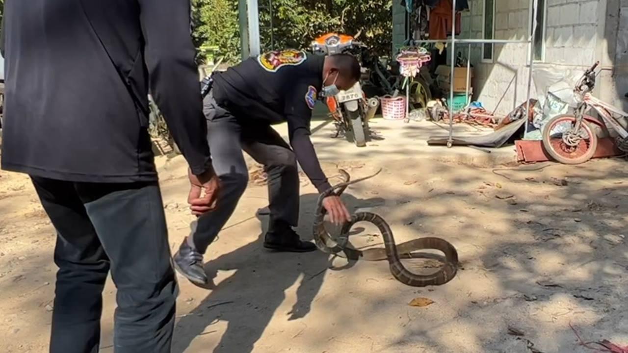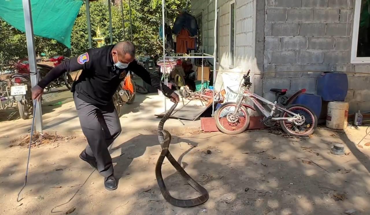 หลังจากได้รับแจ้งแล้วจึงจัดทีมงานผู้เชี่ยวชาญให้เดินทางไปยังที่เกิดเหตุทันที ในเบื้องต้นพบเป็นบ้านปูนชั้นเดียว ไม่มีเลขที่บ้าน สร้างอยู่ในสวนทุเรียนหมอนทองขนาด 6 ไร่ ส่วนงูจงอางหลบอยู่ใต้ตู้เก็บอุปกรณ์ทำครัว และใช้วางอุปกรณ์เตาแก๊ส เจ้าหน้าที่จึงใช้ขอสำหรับดึงงูออกมาแล้วทำการจับหาง แต่งูจงอางพยายามต่อสู้อยู่ตลอดเวลา เจ้าหน้าที่ใช้เวลาอยู่ประมาณ 15 นาที จึงสามารถควบคุมจับหัวของงูจงอางได้ แต่ก็หวิดที่จะโดนฉกกัดหลายครั้ง