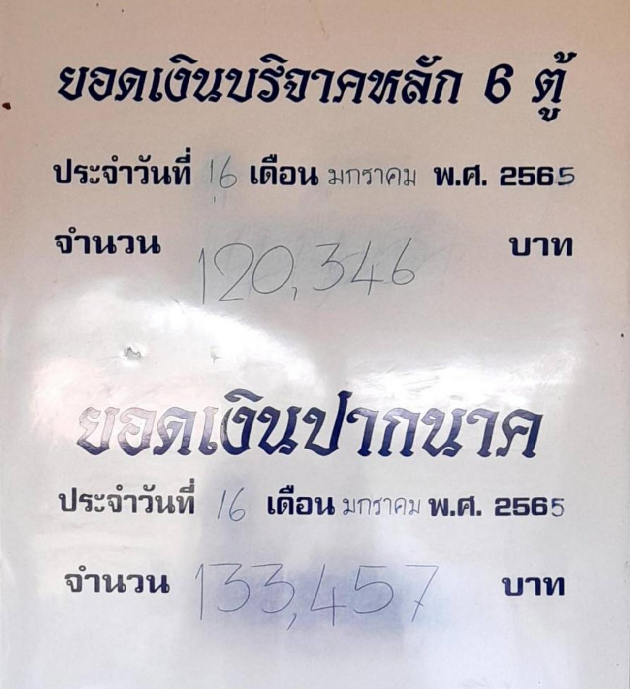 โดยงวดนี้มีนักเสี่ยงโชคบอกว่ามีเลข 37, 73 แต่ที่ไม่ต้องตีเป็นตัวคือยอดเงินปากนาค ที่มีคนชอบเสี่ยงตามตลอด รอบนี้ก่อนวันหวยออกมี ยอดรวมจำนวน 6 ตู้ มียอด 120,346 บาท ส่วนเงินปากนาครอบนี้มีจำนวนเงิน 133,457 บาท