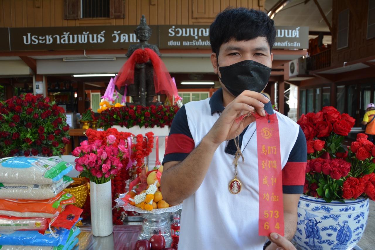 พอผลการออกสลาก ตนมาตรวจดูพบว่าถูกเลขหน้า 3 ตัว และรางวัลที่ 4 ตนช็อกมากเพราะเป็นครั้งแรกที่ถูกรางวัล จึงนำดอกกุหลาบสีแดง 999 ดอก ข้าวสาร 5 กระสอบ มาทำบุญกับเจ้าอาวาส เพื่อแจกจ่ายให้ผู้ที่เดือดร้อน รวมถึงประทัด จ้างรถแห่ และนางรำแต่งชุดสีแดง และ ชวนเพื่อนฝูงมาร่วมเต้นรำวง วนรอบท้าวเวสสุวรรณในวันนี้ จากนั้นจุดประทัดถวาย ได้เลข 573-64 ซึ่งจะได้นำไปเสี่ยงโชคต่อไปด้วย
