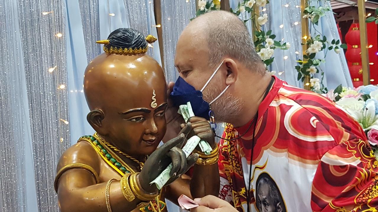 ทั้งนี้ ก่อนเริ่มการแสดง อ้อม เอสโซ่ และ จ๋องแจ๋ง เชิญยิ้ม ตลกชื่อดังได้นำคณะสิงโต เข้าคารวะสิ่งศักดิ์สิทธิ์ภายในวัดและพระอุโบสถที่ปิดทองลูกนิมิตจนครบ จากนั้นก็เข้าคารวะและขอโชคขอลาภจาก กุมารน้องเก้า เลิฟเลิฟ ที่ตั้งอยู่ภายในกองอำนวยการปิดทอง พร้อมกับบนบานศาลกล่าวขอโชคลาภจากกุมารน้องเก้า และแลกเปลี่ยนธนบัตรฉบับละ 100 บาท