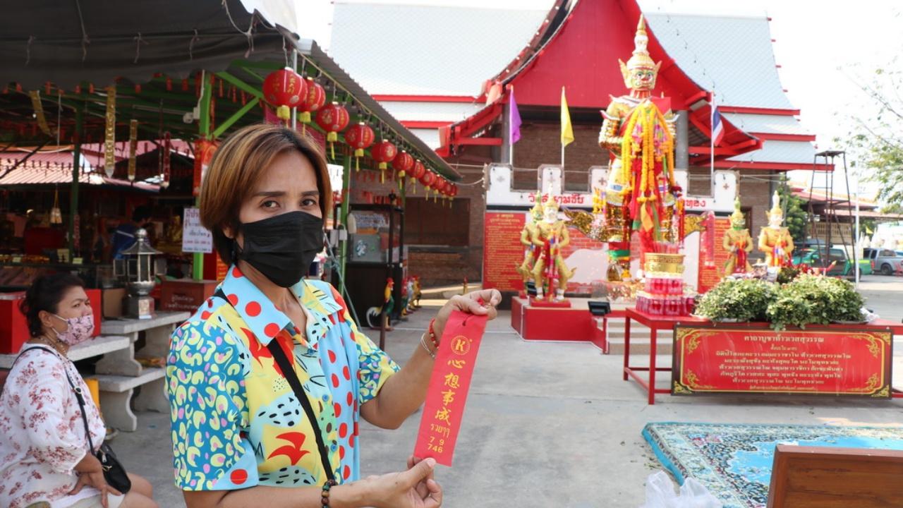 คนดวงเฮงนำกุหลาบแดง 999 ดอก มาแก้บน "ท้าวเวสสุวรรณ" วัดสนามชัย ขณะที่คอหวยไม่พลาด "เลขเด็ดงวดนี้" กลับไปเสี่ยงโชคงวด 16/3/65