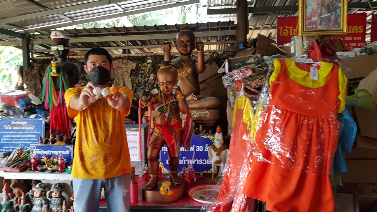 โดยนำสิ่งของแก้บนวางไว้ที่ด้านหน้า และนำชุดโกโกวาแขวนไว้อย่างสวยงาม ก่อนจุดธูปอธิษฐานบอกกล่าวถึงที่มาที่ไปของการได้โชคลาภในครั้งนี้