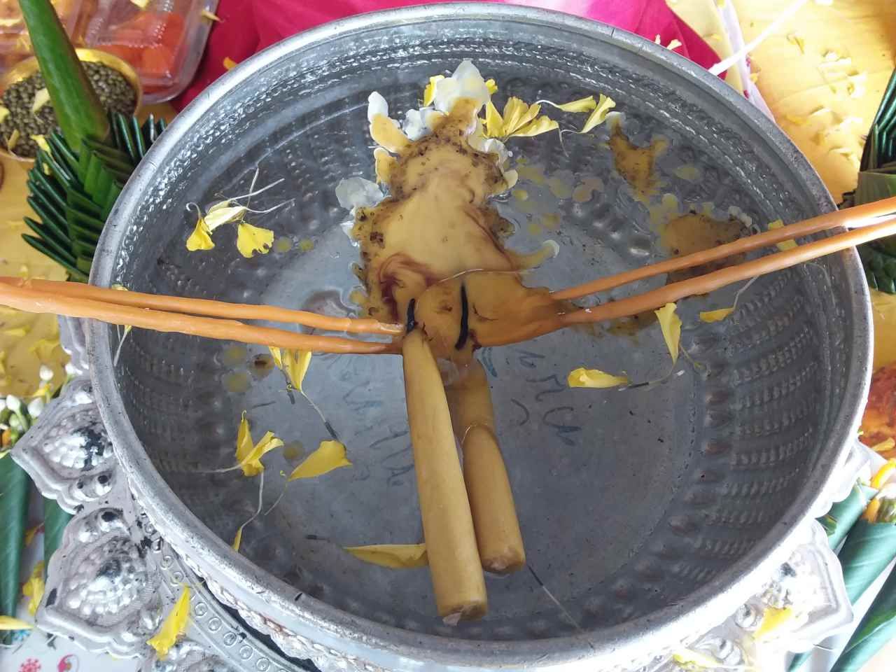 โดยมี ปู่เขียวคำชะโนด ดร.สุวัฒน์ เกินดี พ่อพราหมณ์ชื่อดังมาทำพิธี โดยในพิธีได้นำเครื่องบวงสรวง ผลไม้ หัวหมู ไก่ โต๊ะบวงสรวงขนาดใหญ่มาทำพิธีหอเจ้าแม่สองนางในครั้งนี้ จากนั้นชาวบ้านได้จุดบั้งไฟถวายเจ้าแม่สองนาง พระสนมเอกของปู่ศรีสุทโธ จำนวน 3 บั้ง