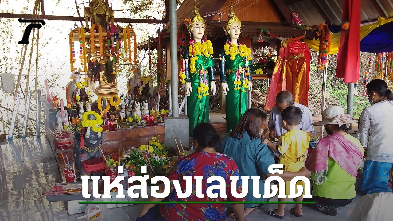 ชาวบ้านช่วยกันส่อง "เลขเด็ด" ธูปมงคล พิธีบวงสรวง "ศาลหอเจ้าแม่สองนาง" จ.อุดรธานี หวังลุ้นโชคงวดนี้