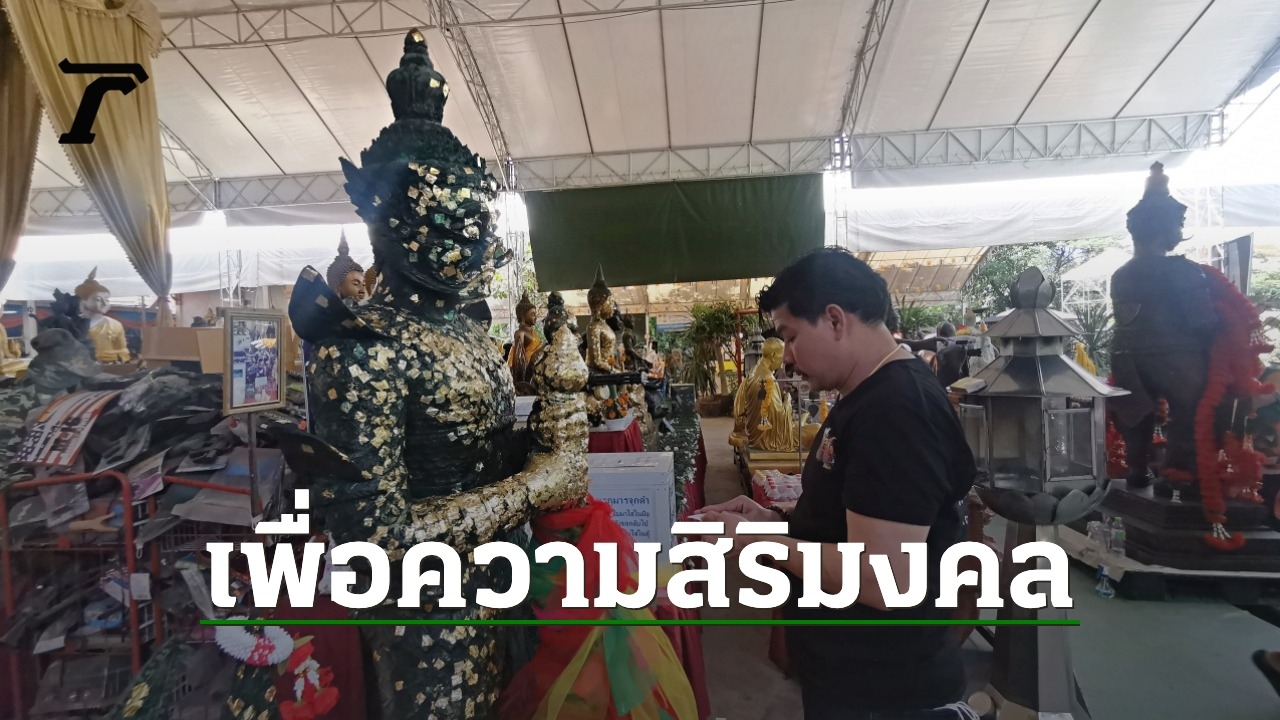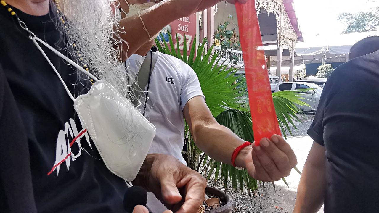 จากนั้น ได้นำพานผลไม้ดอกไม้ธูปเทียนและพวงมาลัยสีแดง พร้อมประทัด 10,000 นัด มากราบไหว้องค์ท้าวเวสสุวรรณ โดยได้บนบานศาลกล่าวขอพรขอโชคลาภ ก่อนคล้องพวงมาลัยและปิดทอง จากนั้นเป็นช่วงที่สาธุชนรอคอย เมื่อถั่วแระ และนุ้ย เชิญยิ้ม นำประทัดไปจุดถวาย บรรดาสาธุชนและนักเสี่ยงโชคต่างตามลุ้นเลขหางประทัด เมื่อเสร็จสิ้นได้นำหางประทัดมาโชว์ให้สาธุชนได้ดู ปรากฏว่าเป็นเลข 276 และ 64