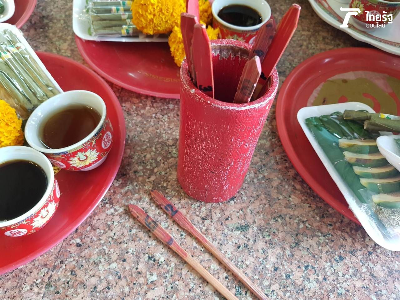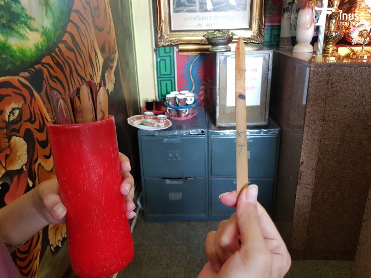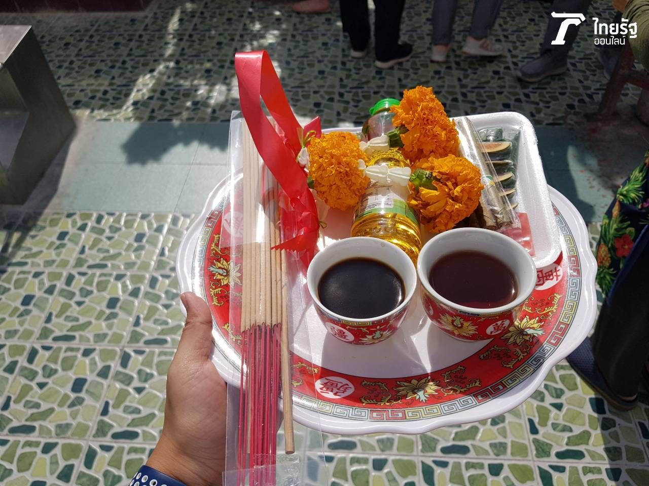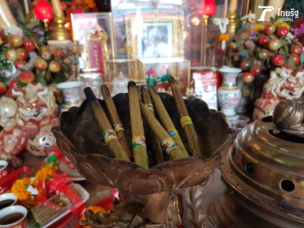 7. จากนั้นเติมน้ำมันตะเกียงฝั่งละครึ่งขวด แล้วแกะหมากพลู พร้อมกับจุดบุหรี่ แล้วนำบุหรี่วางไว้บนแท่น บอกกล่าวกับยี่กอฮงว่านำมาถวาย