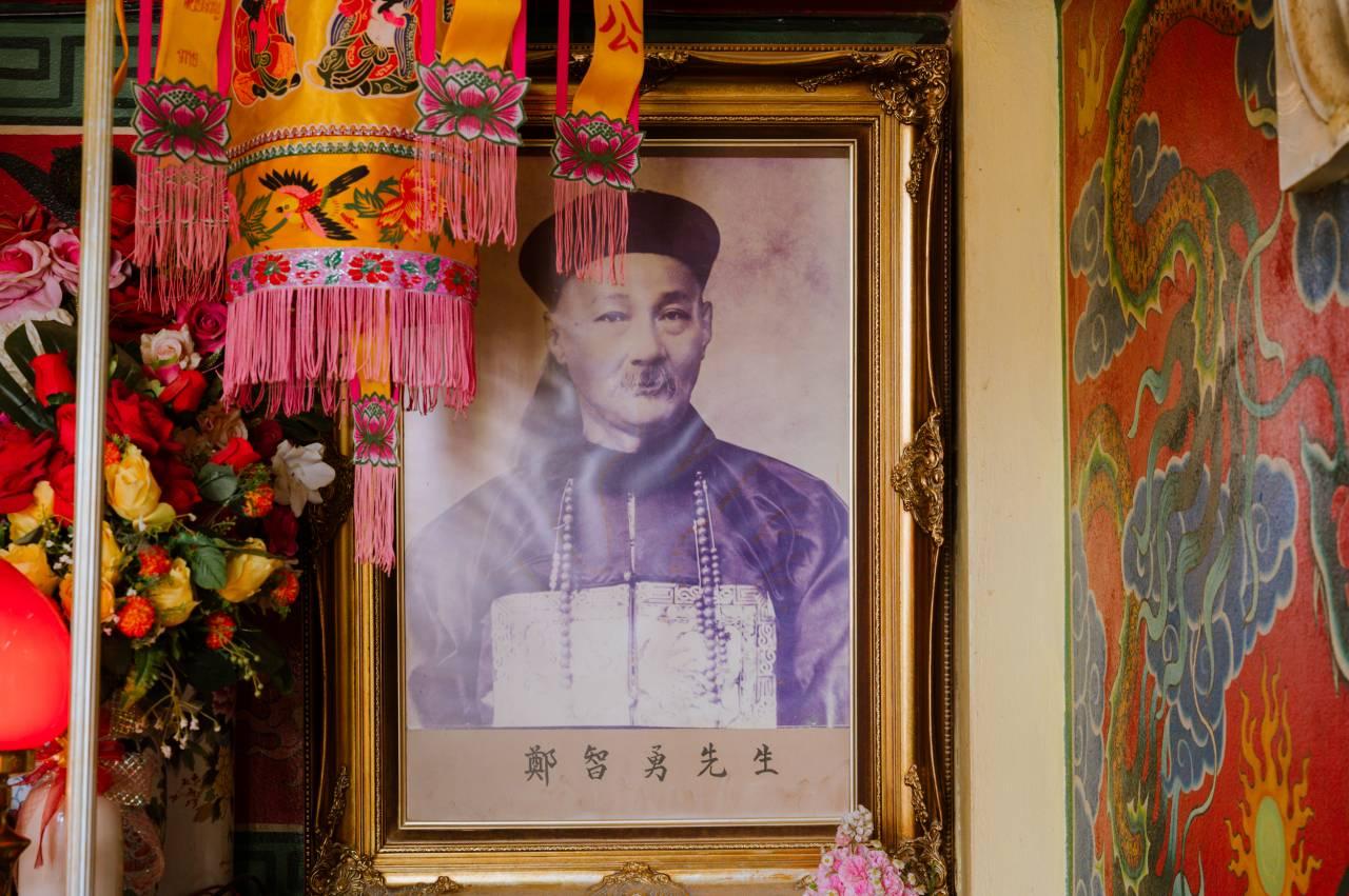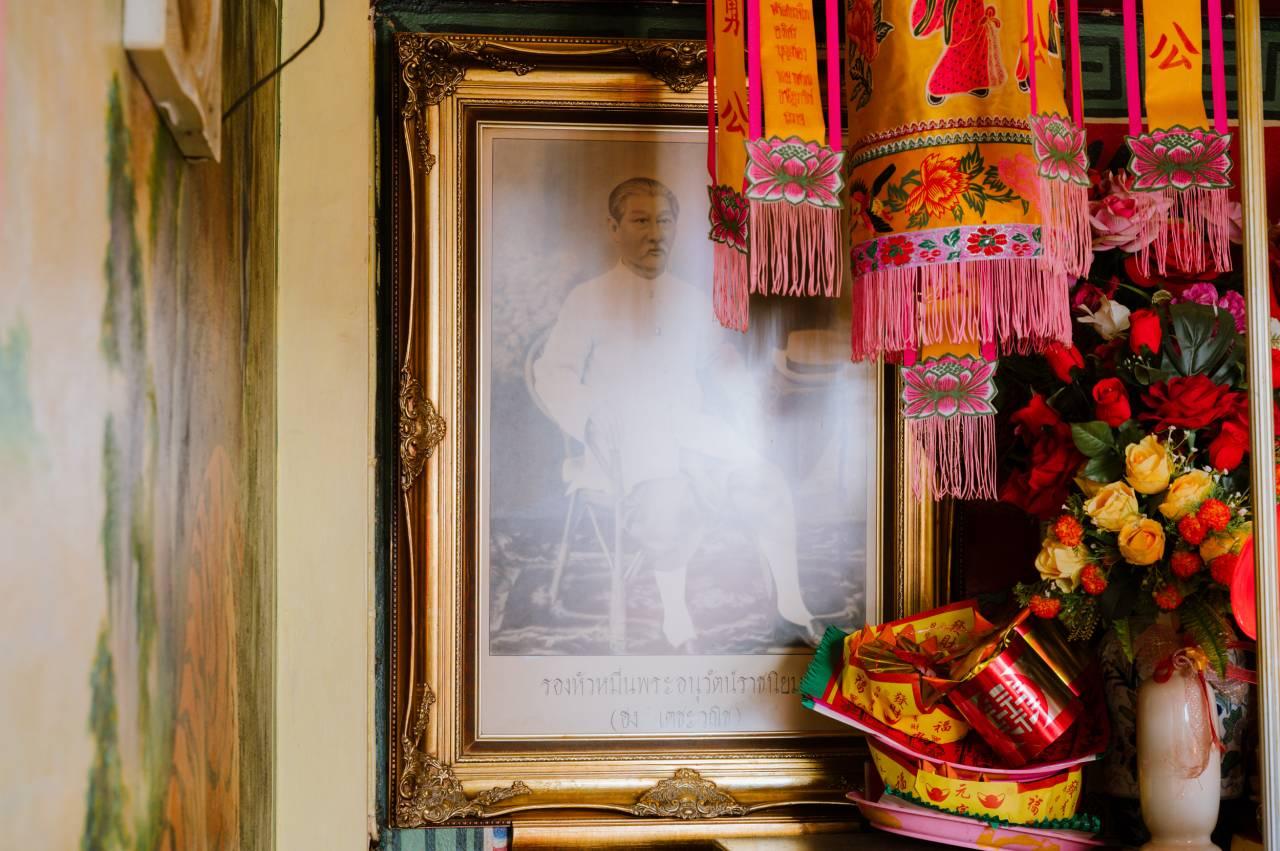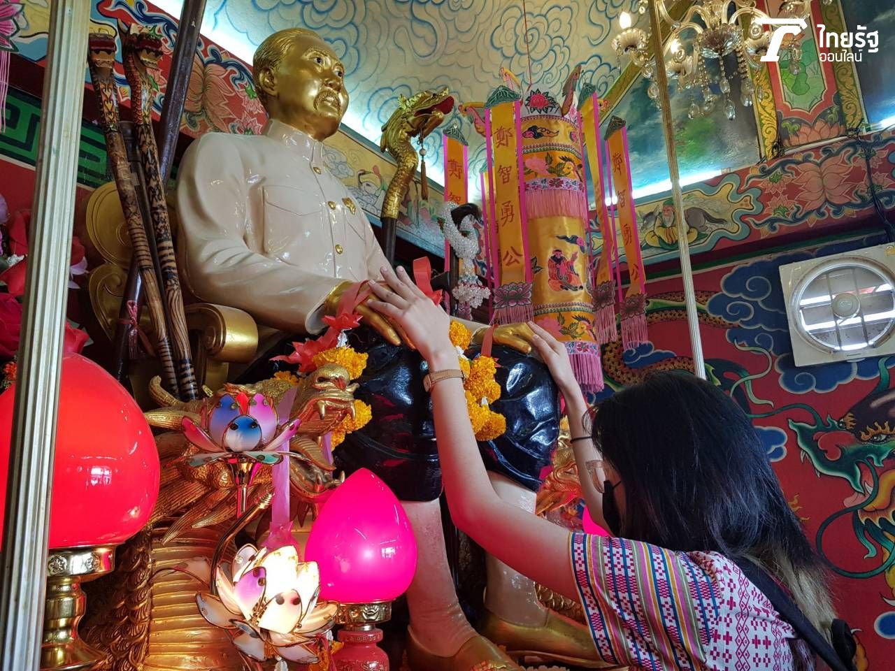 6. นำพวงมาลัยไปถวายยี่กอฮงที่อยู่ภายในศาล โดยจับเข่าของท่านทั้ง 2 ข้างแล้วอธิษฐาน บอกกล่าวชื่อตัวเอง แล้วขอพร