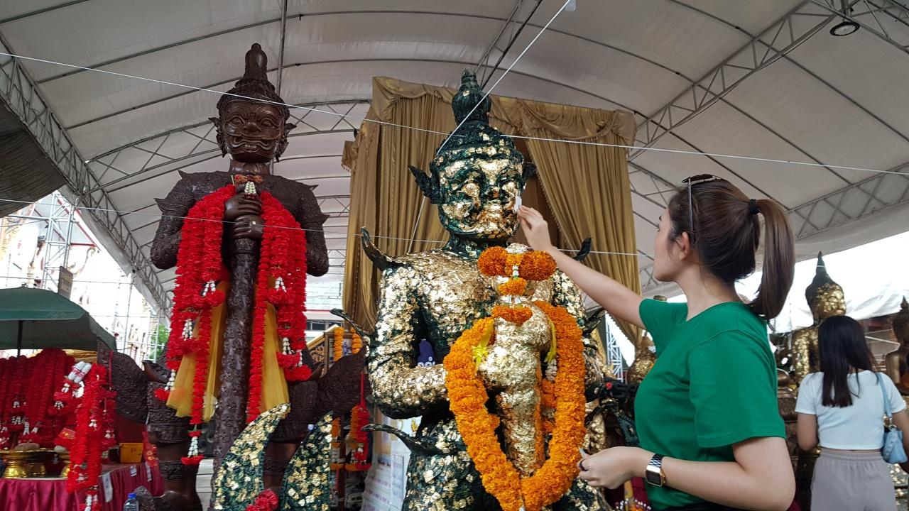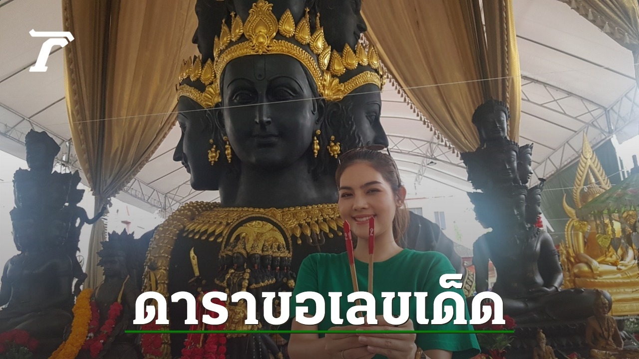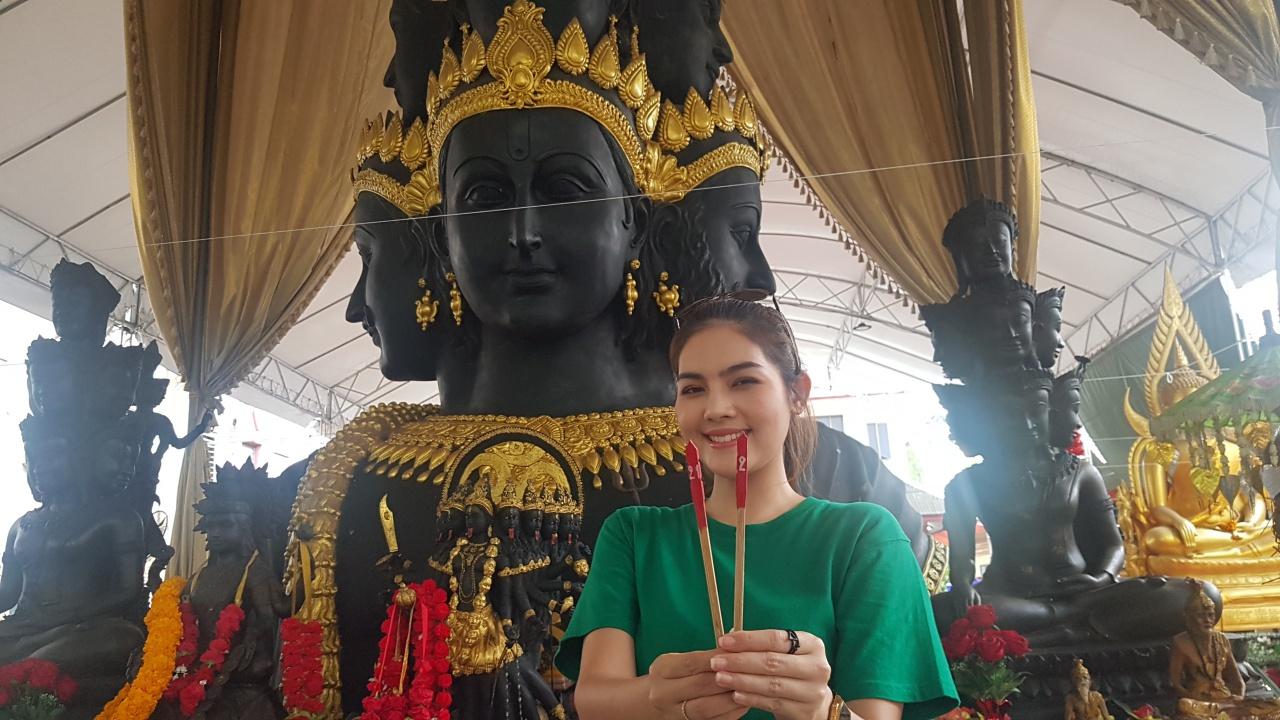 จากนั้นนักแสดงสาว ก็เดินไปกราบองค์ท้าวเวสสุวรรณ ที่บริเวณด้านหน้าพระตรีมูรติ โดยนำพวงมาลัยสีแดง คล้องที่กระบองยันกายขององค์ท้าวเวสสุวรรณ ก่อนจะก้มหน้าผากจรดอธิษฐานที่กระบอง ขอโชคลาภและการงานการเงิน ทั้งยังได้ทำการเขย่าเซียมซี ด้านหน้าองค์พระตรีมูรติ โบนัสถึงกับตกใจไม่คาดคิดว่าทั้งสองไม้จะมีเลขคล้ายเคียงกัน เป็นเลข 21 และ 2 ถือเป็นเลขที่ชื่นชอบ พร้อมกับย้ำว่าจะนำเลขที่ได้ไปเสี่ยงโชค เชื่อว่าเทพเทวดาเมตตา ประทานเลขเด็ดเลขดังให้ พร้อมกับโชว์ไม้เซียมซีให้ดู