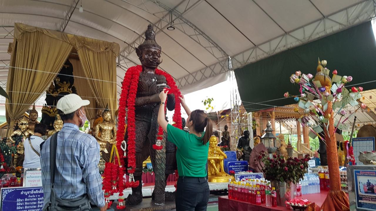 วันที่ 14 กันยายน 2565 ผู้สื่อข่าวรายงานว่า ที่วัดสว่างอารมณ์ แคแถว ต.ขุนแก้ว อ.นครชัยศรี จ.นครปฐม บริเวณทางขึ้นศาลาการเปรียญ สถานที่ประดิษฐานพระตรีมูรติ ปางก้าวหน้า สูง 10 เมตร ใหญ่ที่สุดในประเทศไทย พบกับ โบนัส บุณฑริกา สิงห์เนตร นักแสดงสาวที่มีผลงานล่าสุด เรื่อง ผีกะ จากช่องไทยรัฐทีวี ที่ได้เดินทางมากราบไหว้ขอพรสิ่งศักดิ์สิทธิ์ ทั้งท้าวเวสสุวรรณ และพระตรีมูรติ
