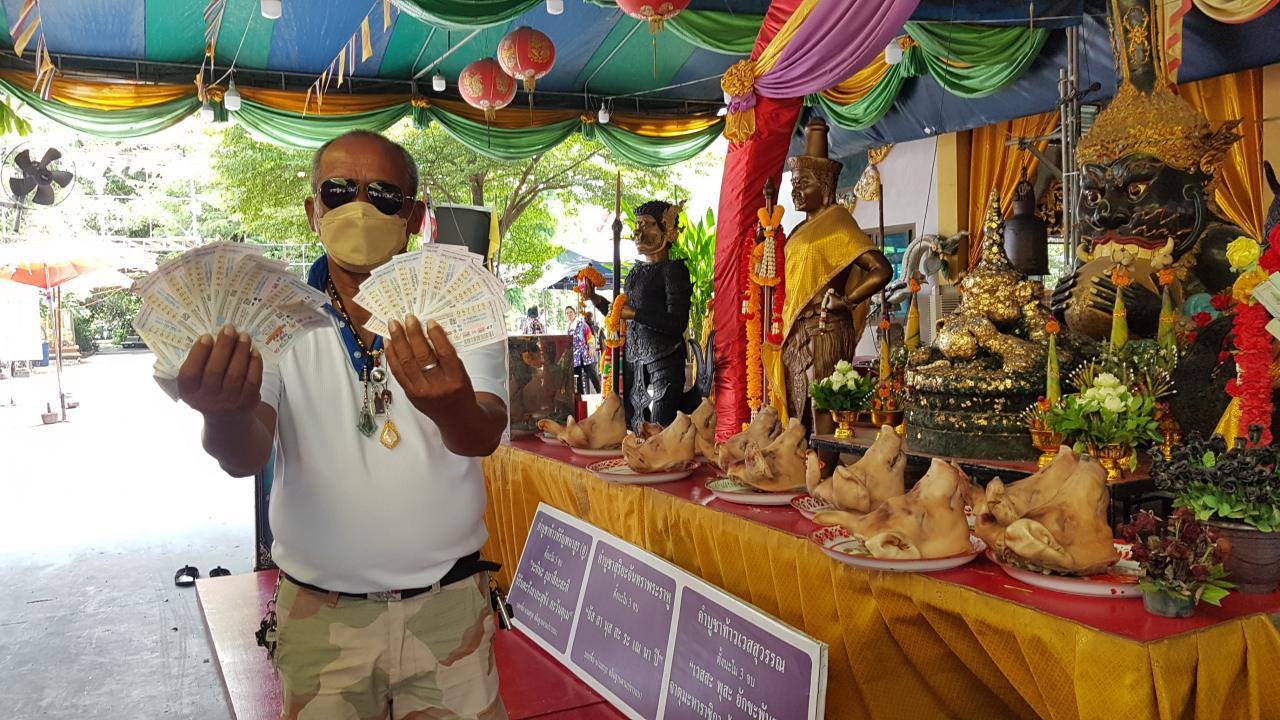 ทั้งนี้จึงสนใจแล้วนำเลขท้ายหางประทัดหมายเลข 375 ไปซื้อรางวัล ซึ่งได้เลข 75 มาจำนวนทั้งหมด 30 ใบ และยังอธิษฐานขอพรว่า หากถูกรางวัลจะนำหัวหมูมาแก้บน 9 หัว โดยกว้านซื้อทั้งในวัดและตลาดสามพรานได้มาเพียงเท่านี้ ตนเชื่อว่าสิ่งศักดิ์สิทธิ์บันดาลโชคให้กับตนจริงๆ