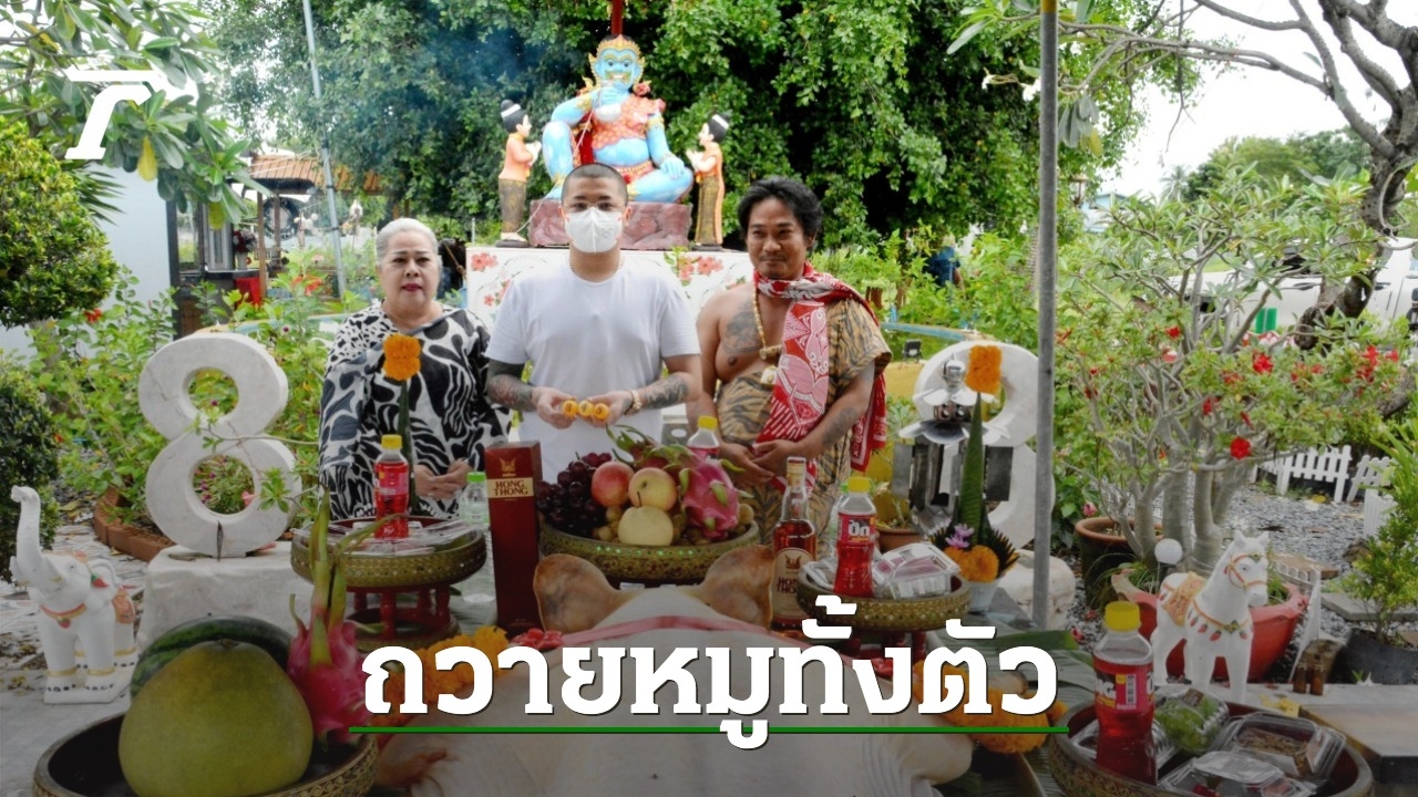 หนุ่มไต้หวัน พร้อมภรรยา ถวายหมูสดทั้งตัว แก้บน "องค์แม่ผีเสื้อสมุทร" อาศรมฤาษี ที่สุพรรณบุรี ไม่กั๊ก เสี่ยง "เลขเด็ด" แบ่งปัน