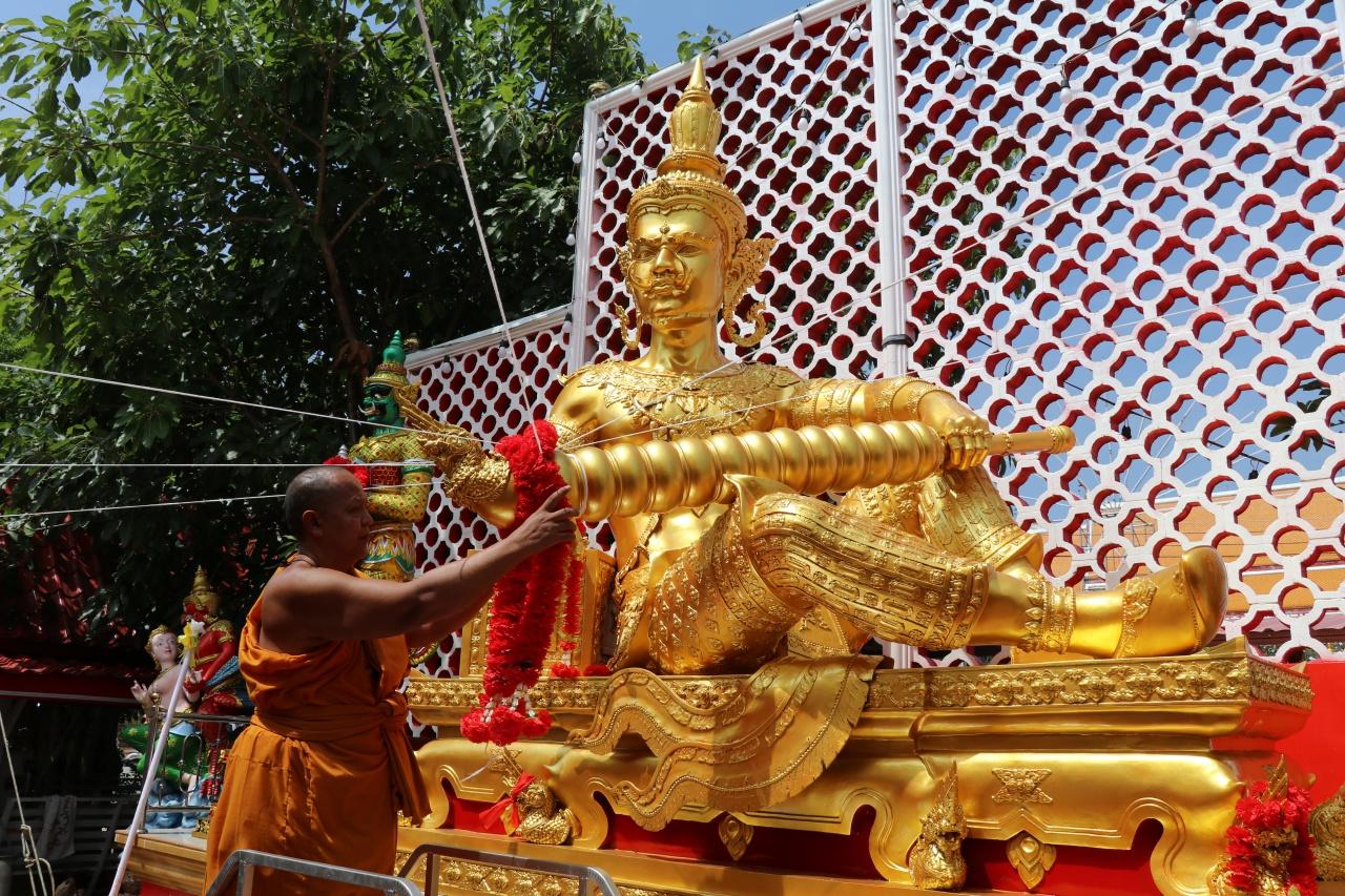 โดยในพิธีมีพระเกจิชื่อดังมานั่งปรกอธิษฐานจิต สวดเจริญชัยมงคลคาถา มีการแสดงนักศึกษาวิทยาลัยนาฏศิลปสุพรรณบุรี แสดงเป็นพญายักษ์ 8 ตน รำถวาย ประกอบด้วย ยักษ์ทศกัณฐ์ ยักษ์มารีศ ยักษ์วิรุฬจำบัง ยักษ์แสงอาทิตย์ ยักษ์อินทรชิต ยักษ์มังกรกัณฐ์ ยักษ์เปวนาสูร และยักษ์พญาสิงขร