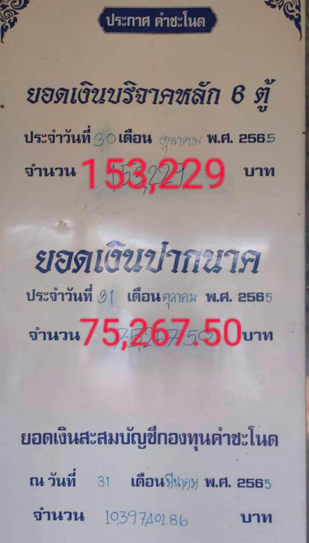 ส่วนยอดเงินปากนาคกรรมการนับทุกวันนับเมื่อวันที่ 31 ตุลาคม ที่ผ่านมา ได้ยอดบริจาคจำนวน 75,267.50 บาท โดยคนที่ชอบเสี่ยงโชคก็จะนำตัวเลขเหล่านี้ไปซื้อลอตเตอรี่ เผื่อว่าจะได้โชคในงวดนี้