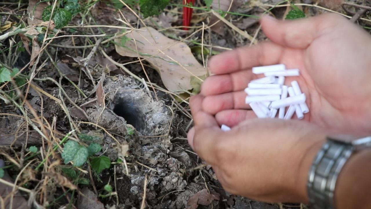 ต่อมาได้ปักธูป และนำกระดาษที่เขียนตัวเลข 1-10 ม้วนไว้ในถุงพลาสติก จำนวน 3 ชุด หย่อนลงไปในรูพญาบึ้ง รอจนกระทั่งกระดาษที่เขียนตัวเลขลงหายไป
